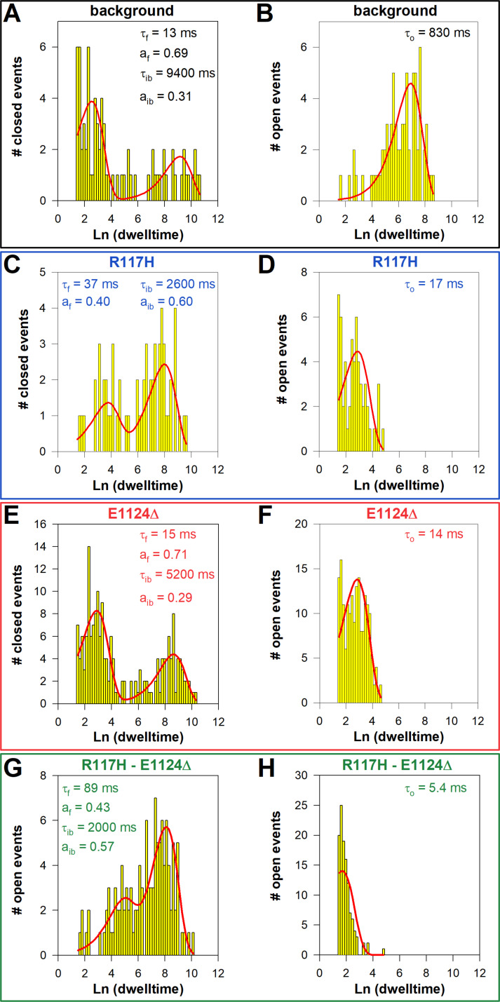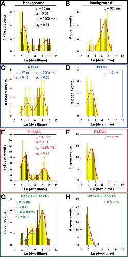 Figure 3âfigure supplement 2. Steady-state dwell-time distributions of the target-site mutants in the D1370N background.(AâH) Closed (A, C, E, G) and open (B, D, F, H) dwell-time histograms (Sigworth and Sine, 1987) constructed from the events list of single-channel records for the indicated CFTR mutants in the D1370N background; lower binning limit is 4 ms. Solid red lines are maximum likelihood fits of the dwell times by the CsâOâCf model (see Materials and methods). Calculated time constants, and for the closed-time histograms the fractional amplitudes (a), are printed in the panels. The two time constants of the closed-time distributions correspond to Ïinterburst and Ïflicker, respectively, that of the open-time distribution to Ïopen.