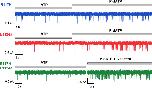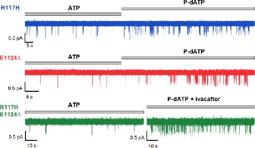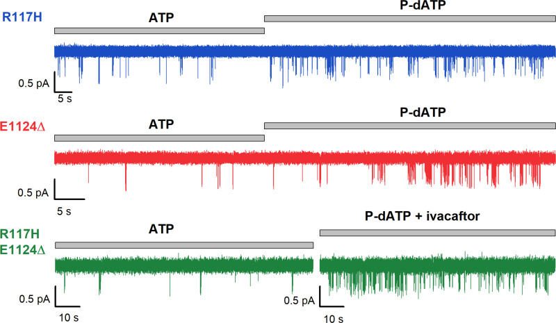 Figure 3—figure supplement 3. Stimulation by P-dATP or P-dATP+ Vx-770 facilitates counting channels for low-Po mutants.Single-channel recordings in 5 mM ATP of the three low-Po mutants in the D1370N background, and robust stimulation of Po by 50 μM N6-(2-phenylethyl)-dATP (P-dATP), with or without 10 nM Vx-770 (ivacaftor). A statistical test based on comparison of the observed opening rate with the cumulative open time (Csanády et al., 2000a) allowed high-confidence exclusion of the presence of a second active channel for each of the three patches shown (p < 0.012, p < 0.03, and p < 0.003, respectively).
