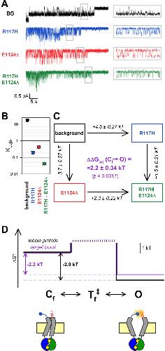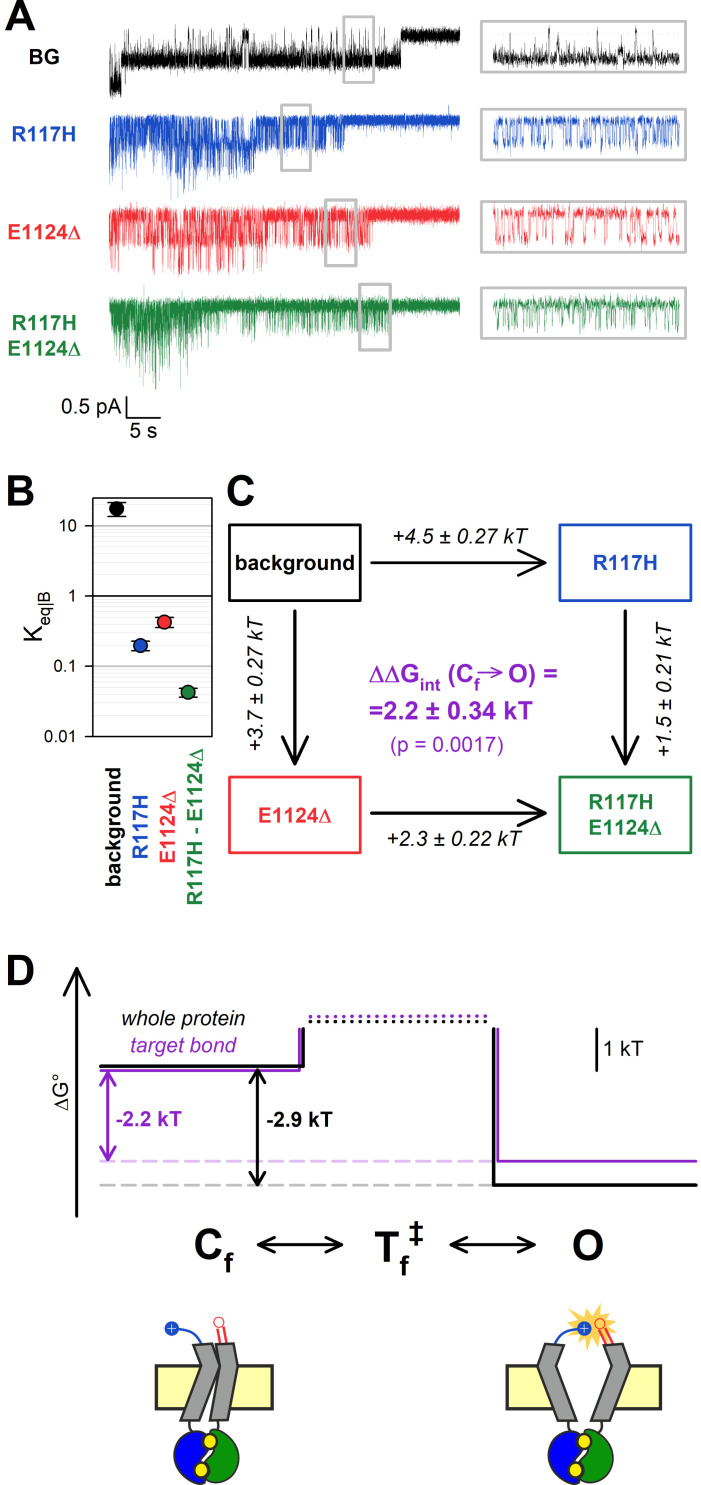 Figure 4. The H-bond between the target positions is broken in the flickery closed state.(A) Currents of last open channels surviving ATP removal, for indicated CFTR mutants (color coded) harboring the E1371S background mutation. Inside-out patch currents were activated by exposure of pre-phosphorylated channels to 5 mM ATP. Insets (right) show 5 s segments corresponding to gray boxes at an expanded time scale. Vm was â80 mV. (B) Closed-open equilibrium constants within a burst (see Materials and methods). Data are shown as mean ± SEM from five to six patches; note logarithmic ordinate. SEM was calculated by error propagation (see Materials and methods). (C) Thermodynamic mutant cycle showing mutation-induced changes in the stability of the O state relative to the Cf state (ÎÎGO-Cf0, numbers on arrows; k, Boltzmannâs constant; T, absolute temperature). Each corner is represented by the mutations introduced into positions 117 and 1124 of E1371S-CFTR. ÎÎGint (purple number) is obtained as the difference between ÎÎG0 values along two parallel sides of the cycle. (D) (Top) Free enthalpy profile of the entire channel protein (black curve) and of the 117â1124 interaction (purple curve) along the states of the intraburst (OâCf) gating process (see Materials and methods). (Bottom) Cartoon representation of channel conformations in the Cf and O states. Color coding as in Figure 3F.