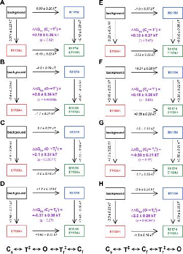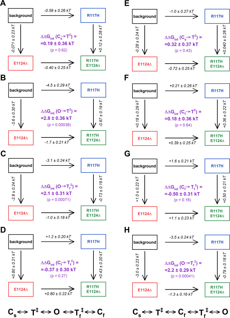 Figure 5—figure supplement 1. Mutant cycles built on the four microscopic transition rate constants for the two alternative three-state schemes.(A–H) Thermodynamic mutant cycles showing mutation-induced changes in the heights of the free enthalpy barriers (ΔΔG0) for the four microscopic transitions contained in the (A–D) Cs↔O↔Cf or (E–H) Cs↔Cf↔O model, respectively (numbers on arrows; k, Boltzmann’s constant; T, absolute temperature). Each corner is represented by the mutations introduced into positions 117 and 1124 of D1370N-CFTR. ΔΔGint (purple numbers) are obtained as the differences between ΔΔG0 values along two parallel sides of a cycle. Gating steps: A, Cs→O; B, O→Cs; C, O→Cf; D, Cf→O; E, Cs→Cf; F, Cf→Cs; G, Cf→O; H, O→Cf.