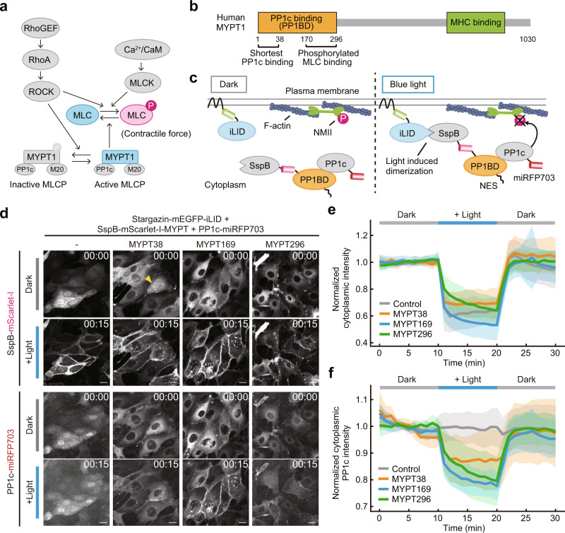 Actomyosin contractility generated cooperatively by nonmuscle myosin II and actin filaments plays essential roles in a wide range of biological processes, such as cell motility, cytokinesis, and tissue morphogenesis. However, subcellular dynamics of actomyosin contractility underlying such processes remains elusive. Here, we demonstrate an optogenetic method to induce relaxation of actomyosin contractility at the subcellular level. The system, named OptoMYPT, combines a protein phosphatase 1c (PP1c)-binding domain of MYPT1 with an optogenetic dimerizer, so that it allows light-dependent recruitment of endogenous PP1c to the plasma membrane. Blue-light illumination is sufficient to induce dephosphorylation of myosin regulatory light chains and a decrease in actomyosin contractile force in mammalian cells and Xenopus embryos. The OptoMYPT system is further employed to understand the mechanics of actomyosin-based cortical tension and contractile ring tension during cytokinesis. We find that the relaxation of cortical tension at both poles by OptoMYPT accelerated the furrow ingression rate, revealing that the cortical tension substantially antagonizes constriction of the cleavage furrow. Based on these results, the OptoMYPT system provides opportunities to understand cellular and tissue mechanics.