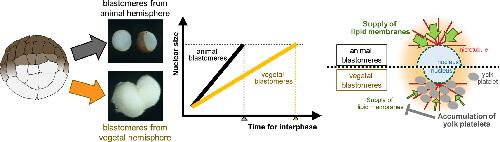 During metazoan early embryogenesis, the intracellular properties of proteins and organelles change dynamically through rapid cleavage. In particular, a change in the nucleus size is known to contribute to embryonic development-dependent cell cycle and gene expression regulation. Here, we compared the nuclear sizes of various blastomeres from developing Xenopus embryos and analyzed the mechanisms that control the nuclear expansion dynamics by manipulating the amount of intracellular components in a cell-free system. Nuclear expansion was slower in blastomeres from vegetal hemispheres during a longer interphase than in those from animal hemispheres. Furthermore, upon recapitulating interphase events by manipulating the concentration of yolk platelets, which are originally rich in the vegetal blastomeres, in cell-free cytoplasmic extracts, nuclear expansion and DNA replication became slower than that in normal yolk-free conditions. Under these conditions, the supplemented yolk platelets accumulated around the nucleus in a microtubule-dependent manner and impeded the organization of the endoplasmic reticulum network. Overall, we propose that yolk platelets around the nucleus reduce membrane supply from the endoplasmic reticulum to the nucleus, resulting in slower nuclear expansion and cell cycle progression in the yolk-rich vegetal blastomeres.