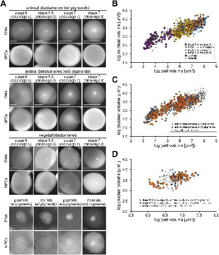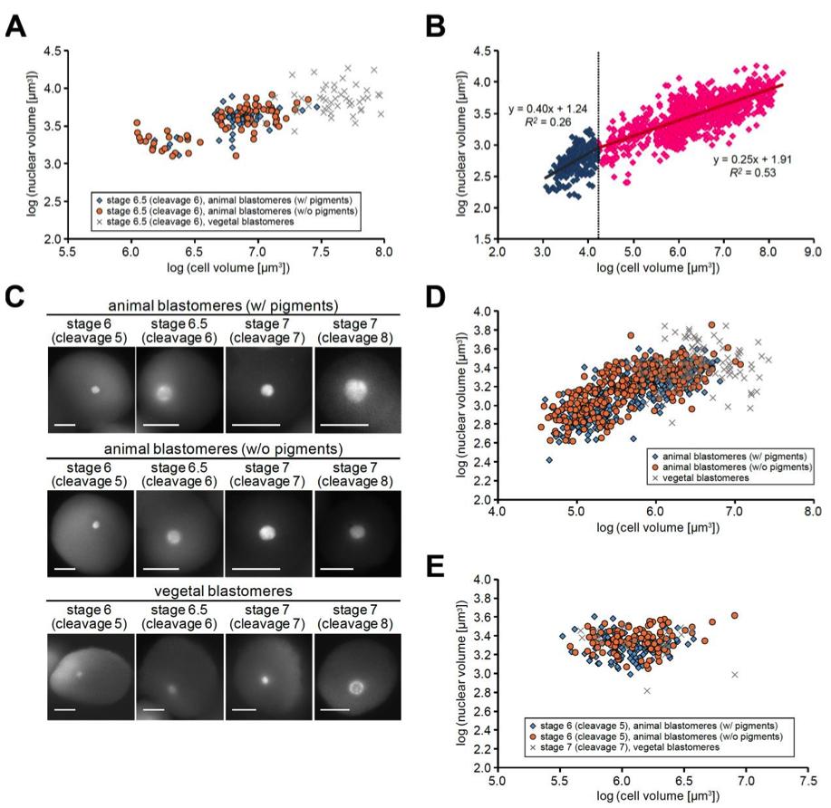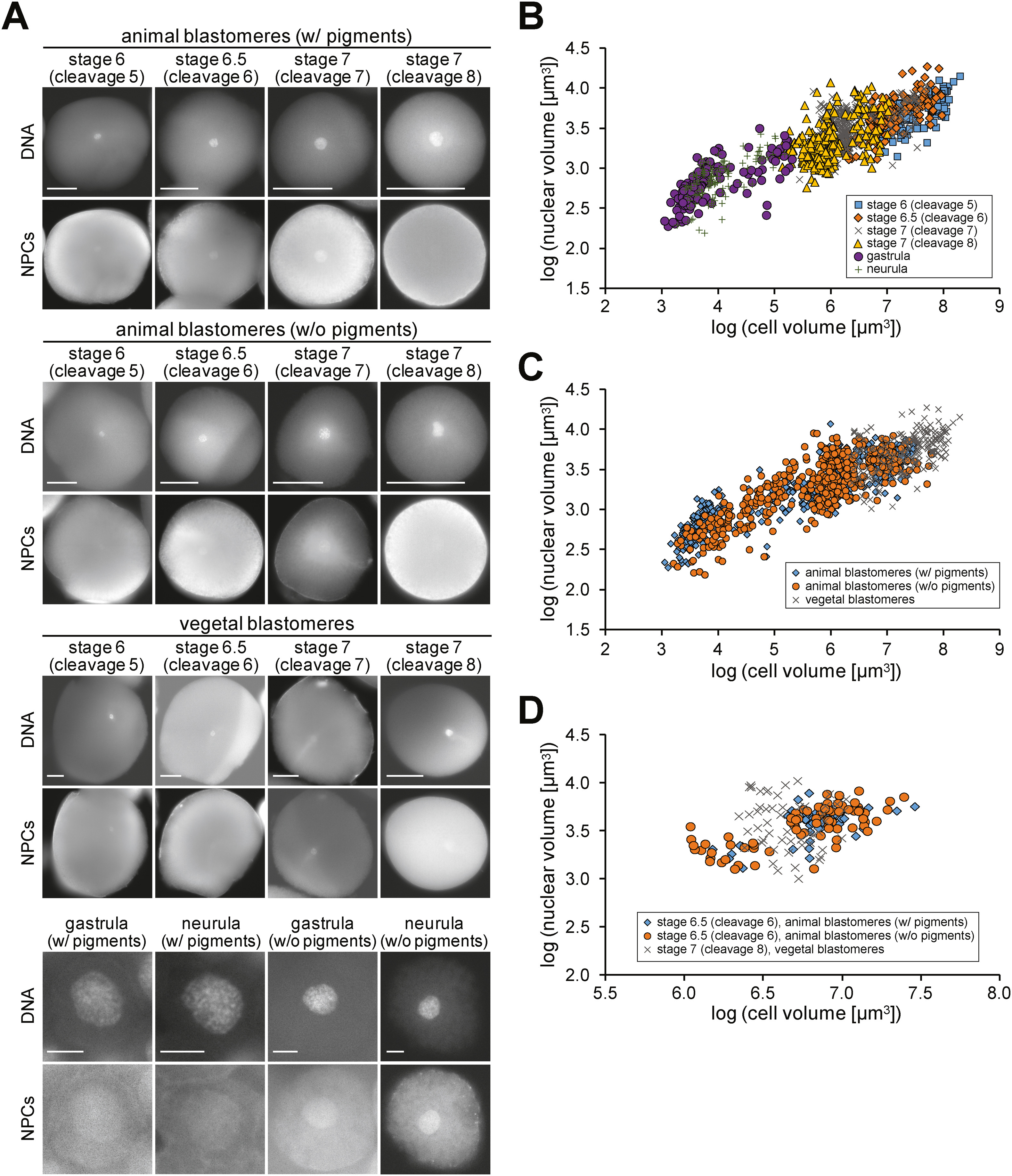 (A) DNA (top; stained using TO-PRO-3) and NPCs (bottom: immunostaining) were visualized in dissociated blastomeres from X. laevis developing embryos. The blastomeres from embryos at various developmental stages were classified into three different groups; blastomeres with black pigments from the animal hemisphere [animal blastomeres (w/pigments)], blastomeres without black pigments from the animal hemisphere [animal blastomeres (w/o pigments)], and blastomeres from vegetal hemispheres (vegetal blastomeres). Scale bar: 100 âμm. The animal blastomeres from gastrula and neurula embryos were classified into those with or without pigments. Scale bar: 10 âμm. (B) Calculated nuclear volume was plotted against the calculated cell volume of blastomeres from different developmental stages of embryos [stage 6 (cleavage 5): n â= â139; stage 6.5 (cleavage 6): n â= â182; stage 7 (cleavage 7): n â= â278; stage 7 (cleavage 8): n â= â229; gastrula: n â= â225; neurula: n â= â110]. (C) Data of the nuclear and cell volumes were classified into the different blastomere groups (different colors). The values were identical to those in panel B. Animal blastomeres (w/pigments): n â= â521; (w/o pigments): n â= â452; vegetal blastomeres: n â= â190. (D) Only data of the nuclear and cell volumes in animal blastomeres (w/pigments: n â= â60; w/o pigments: n â= â75) from stage 6.5 (cleavage 6) embryos and vegetal blastomeres (n â= â52) from stage 7 (cleavage 8) embryos were represented.