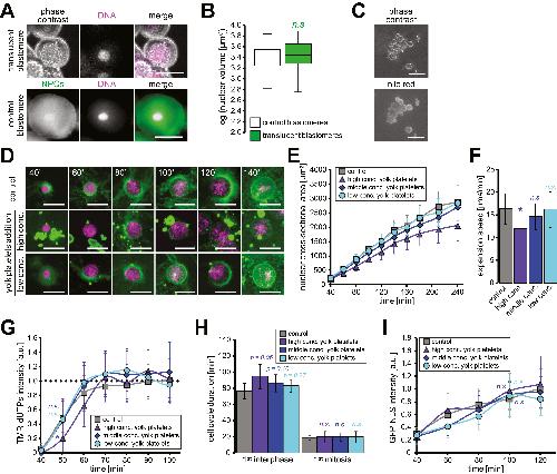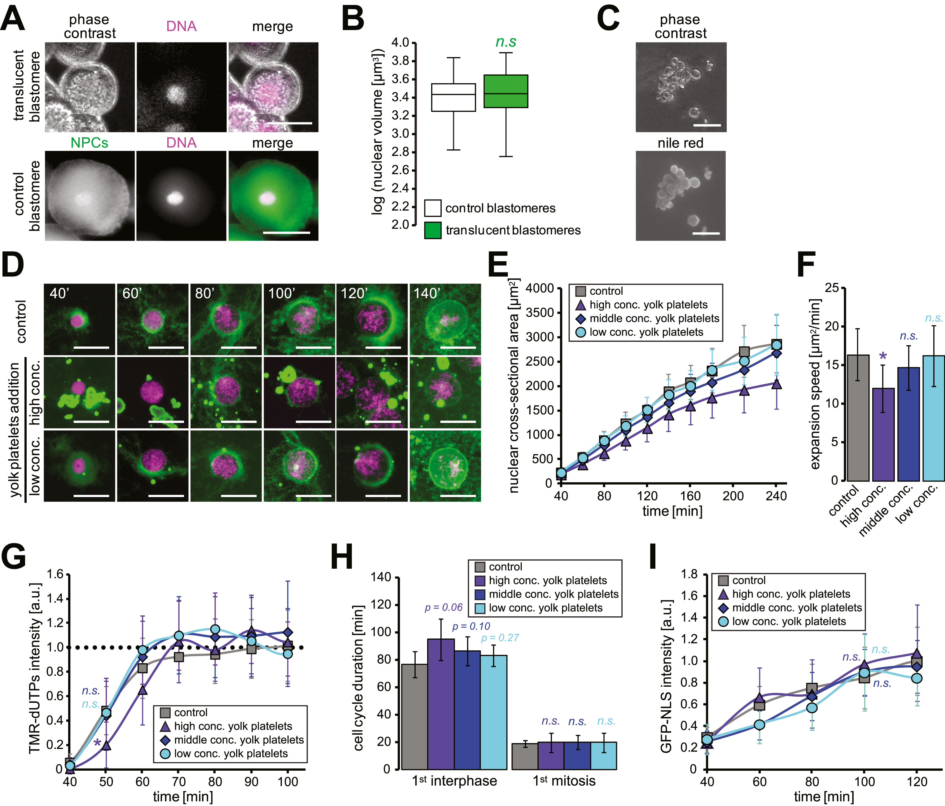 (A) Representative images of translucent (top) and normal (bottom) blastomeres from X. laevis embryos. DNA (magenta) was visualized using Hoechest33342 and merged with phase contrast image (top) or an image of NPCs (green), visualized using immunohistochemistry (bottom). Scale bar: 50 âμm. (B) Box plots of the calculated nuclear volumes from the translucent blastomeres (green: n â= â58) and control animal blastomeres (white: n â= â261) showing the cell radius ranging from 25 âμm to 50 âμm. The data of each blastomere were obtained from embryos from the same mother frog. (C) Representative images of isolated yolk platelets - phase contrast (top) and stained using Nile Red (bottom). Scale bar: 30 âμm. (D) Representative images of reconstructed nuclei in X. laevis egg extracts upon supplementation with isolated yolk platelets at different concentrations. DNA (magenta; stained using Hoechst33342) and membrane [green; stained using DiOC6(3)] were visualized in the fixed sample at the indicated time of incubation. Scale bar: 50 âμm. (E) Dynamics of the measured mean cross-sectional area and (F) calculated expansion speed of cross-sectional area in the nuclei reconstructed with different concentrations of yolk platelets [control: n â= â16; high conc. (1â2 âà â105/μl): n â= â13; middle conc. (2â4 âà â104/μl): n â= â10; low conc. (4â8 âà â103/μl): n â= â9]. âP â< â0.05, statistically significant difference and n.s., no significant difference with Wilcoxon test compared to the control condition. (G) Dynamics of the intensities of the incorporated TMR-dUTPs within the nucleus. The intensity was calculated by multiplying the measured TMR-dUTPs intensity (/μm2) with the measured nuclear cross-sectional area. Each calculated value was divided by the mean value of the individual extract preparation after 120 âmin of incubation in the control condition. Control: n â= â8; high conc.: n â= â5; middle conc.: n â= â4; low conc.: n â= â3. Averages of values from each extract preparation are connected using a line in each dataset. âP â< â0.05, statistically significant difference and n.s., no significant difference from datasets of the values after 50 âmin of incubation with Wilcoxon test compared to the control condition. (H) Measured duration of each cell cycle upon supplementation with the isolated yolk platelets at different concentrations in the cycling extract. The extracts, upon addition of sperm chromatin, initially expose interphase (1st interphase), then transit spontaneously to mitosis (1st mitosis), and interphase of the next cell cycle. P values obtained with Wilcoxon test are shown. n.s., no significant difference (P â> â0.1). Control: n â= â8; high conc.: n â= â3; middle conc.: n â= â3; low conc.: n â= â3. (I) Dynamics of the mean GFP-NLS intensity per nuclear cross-sectional area among samples reconstructed with different concentrations of yolk platelets (control: n â= â6; high conc.: n â= â5; middle conc.: n â= â4; low conc.: n â= â4). The measured intensity value was divided by that of the control condition after 120 âmin of incubation for each preparation. n.s., no significant difference from datasets of the values after 100 âmin of incubation with Wilcoxon test compared to the control condition. Average values (±SD) from each extract preparation were shown in each dataset.