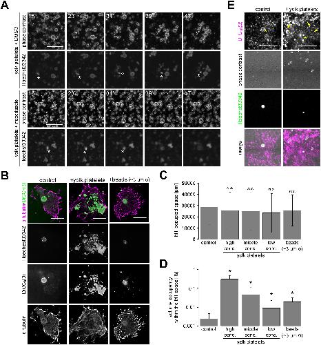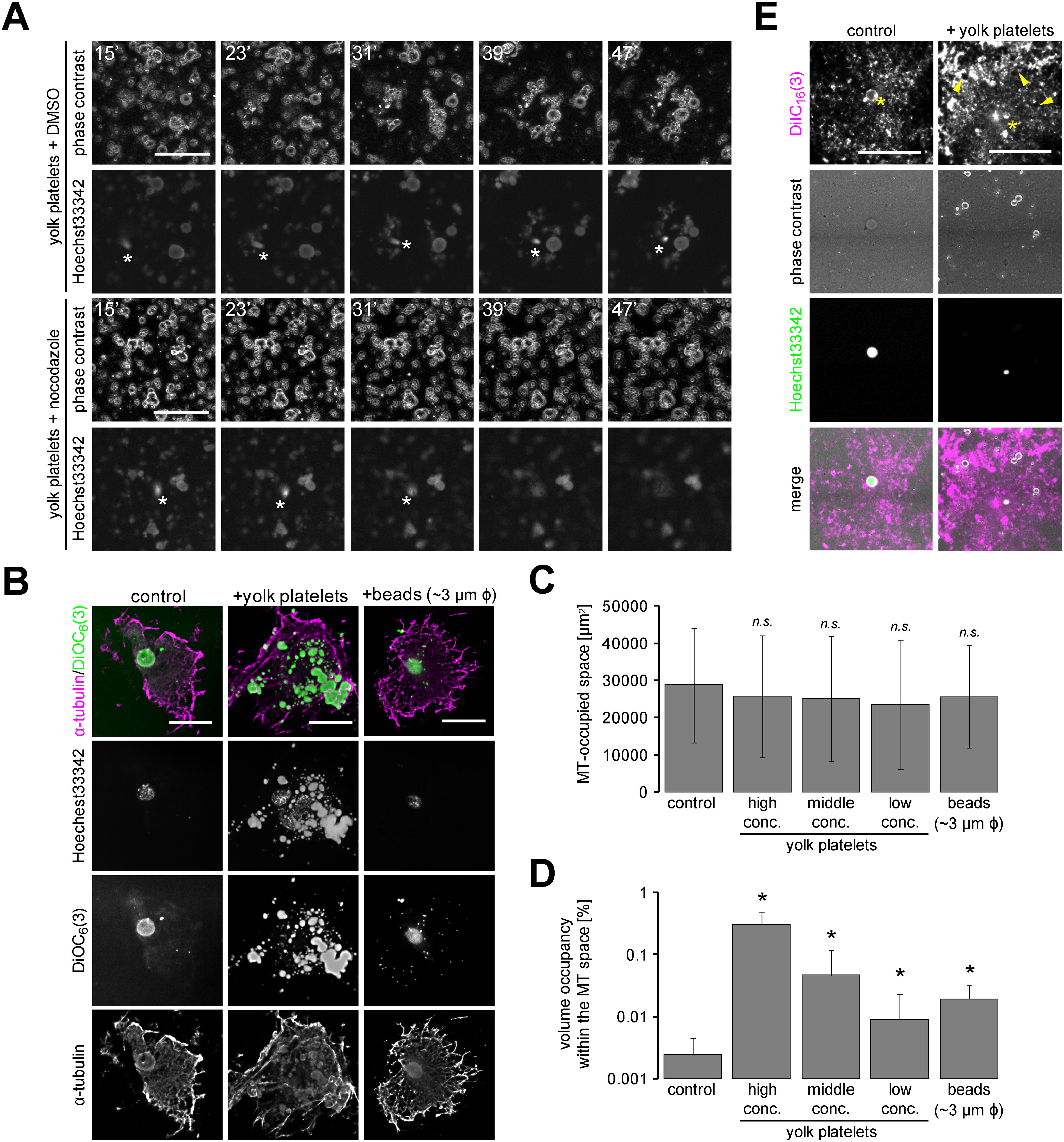 (A) Snapshots of representative time-lapse images of the reconstructed nuclei in the cytoplasmic extract upon supplementation with yolk platelets at a concentration of 1–2 × 105/μl in the presence of DMSO (for buffer control: top) or nocodazole (bottom). DNA was visualized using Hoechest33342. Bright field images were taken using phase contrast. Asterisks represent chromatin in the extracts. Scale bar: 50 μm. (B) α-tubulin (magenta; immunostaining), membranes [green; stained using DiOC6(3)], and DNA (blue; stained using Hoechst33342) were visualized in the sedimented samples on a glass slide. The nuclei were reconstructed by supplementation with buffer (control), yolk platelets at the concentration of 1–2 × 105/μl (high concentration), or 3 μm diameter magnetic beads at a concentration of ∼5 × 105/μl for 120 min of incubation. Scale bar: 100 μm. (C) Measured mean area of MT-occupied space in each sample upon supplementation with buffer (n = 35), yolk platelets at high concentration (n = 32), middle concentration (2–4 × 104/μl: n = 36), low concentration (4–8 × 103/μl: n = 31), or 3 μm diameter magnetic beads (n = 41). (D) Calculated mean area occupancy of yolk platelets or magnetic beads within the MT-occupied space. Error bars, SD. ∗P < 0.05, statistically significant difference and n.s., no significant difference with Wilcoxon test compared to the control condition. (E) Representative images of the reconstructed nuclei (asterisks) with DiIC16(3)-positive ER in the presence of DMSO (control) or yolk platelets at the concentration of 1–2 × 105/μl for 60 min of incubation. Arrowheads represent the positions of yolk platelets. Scale bar: 50 μm.