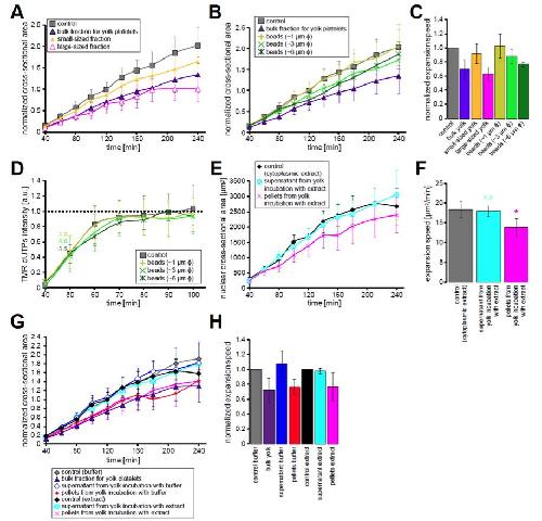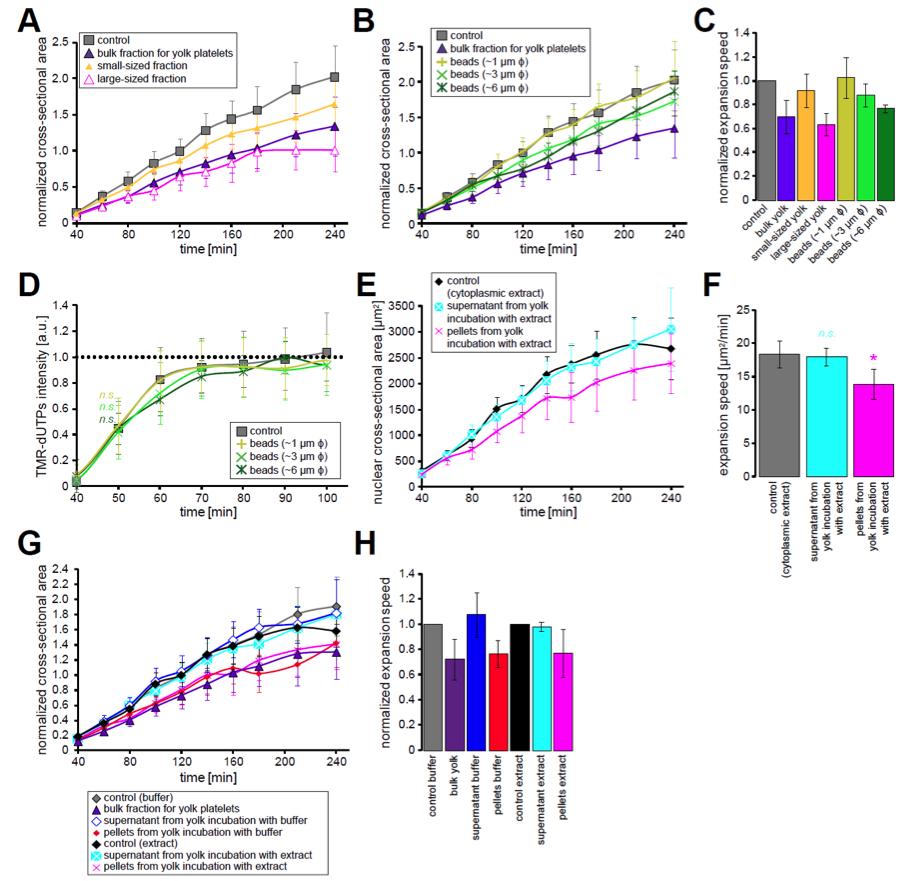 (A) Dynamics of the mean normalized cross-sectional area in the reconstructed nuclei by supplementation with different-sized yolk platelets. (B) Dynamics of the mean normalized cross-sectional area in the reconstructed nuclei upon supplementation with each artificial bead. (C) Mean normalized expansion speed of nuclear cross-sectional area in the samples upon supplementation with yolk platelets or artificial beads. (D) Dynamics of the intensities of the incorporated TMR-dUTP in whole nuclei in the presence of artificial beads with different sizes. The intensity was calculated by multiplying the measured TMR-dUTP intensity (/μm2) with the measured nuclear cross-sectional area. Each calculated value was divided by the mean value of the individual extract preparation after 120 min of incubation in the absence of any supplements. n.s., no significant difference from data of the normalized total intensity in the individual nuclei after 50 min of incubation with Wilcoxon test compared to the control condition (P > 0.05). (E) Dynamics of the measured mean cross-sectional area and (F) expansion speed of cross-sectional area in the reconstructed nuclei upon supplementation with supernatant (light blue; n = 3) or pellets (pink; n = 3) from pre-incubation of yolk platelets with cytoplasmic extract. * P < 0.05, statistically significant difference and n.s., no significant difference with Wilcoxon test compared to the control condition. (G) Dynamics of the mean normalized cross-sectional area and (H) normalized expansion speed of cross-sectional area in the nuclei reconstructed upon supplementation with supernatant or pellet from pre-incubation of yolk platelets with extraction buffer or cytoplasmic extract. Average values (±SD) from each extract preparation were shown in each dataset.