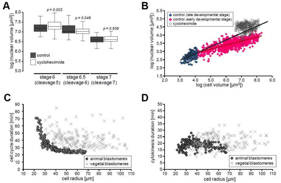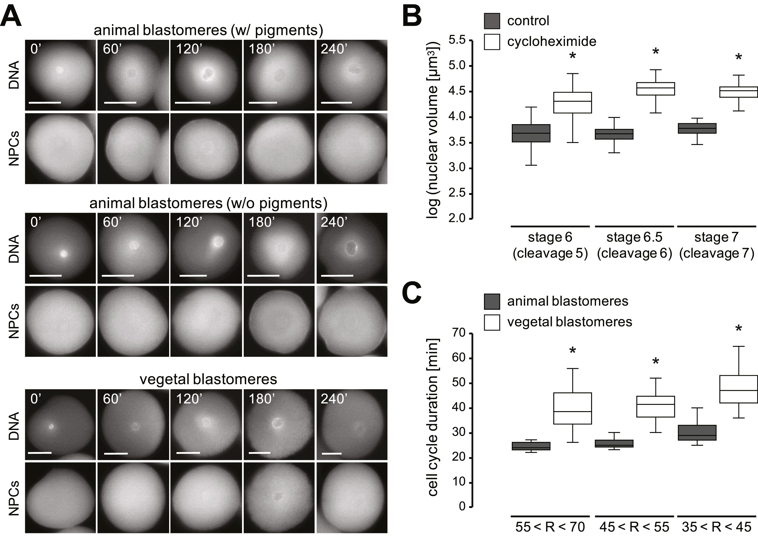 (A) DNA (top: stained using TO-PRO-3) and NPCs (bottom: immunostaining) were visualized in dissociated blastomeres of three different groups from X. laevis embryos treated with cycloheximide. Time represents that after incubation of the dissociated blastomeres with cycloheximide. Scale bar: 100 âμm. (B) Box plots of the calculated nuclear volumes from the animal blastomeres treated with cycloheximide for 180â240 âmin (white) and control buffer (grey) for each developmental stage [stage 6 (cleavage 5): n â= â113 (cycloheximide), n â= â196 (control); stage 6.5 (cleavage 6): n â= â56 (cycloheximide), n â= â225 (control); stage 7 (cleavage 7): n â= â78 (cycloheximide), n â= â152 (control)]. âP â< â0.05, statistically significant difference with Wilcoxon test compared to the control condition at each developmental stage. (C) Box plots of the measured cell cycle duration from the animal blastomeres (grey) and vegetal blastomeres (white) for each group categorized by the cell radius R (μm) [55 â< âR â< â75: n â= â26 (animal), n â= â46 (vegetal); 45 â< âR â< â55: n â= â48 (animal), n â= â40 (vegetal): 35 â< âR â< â45: n = 101 (animal), n â= â27 (vegetal)]. âP â< â0.05, statistically significant difference with Wilcoxon test compared to the animal blastomere at each cell size group.