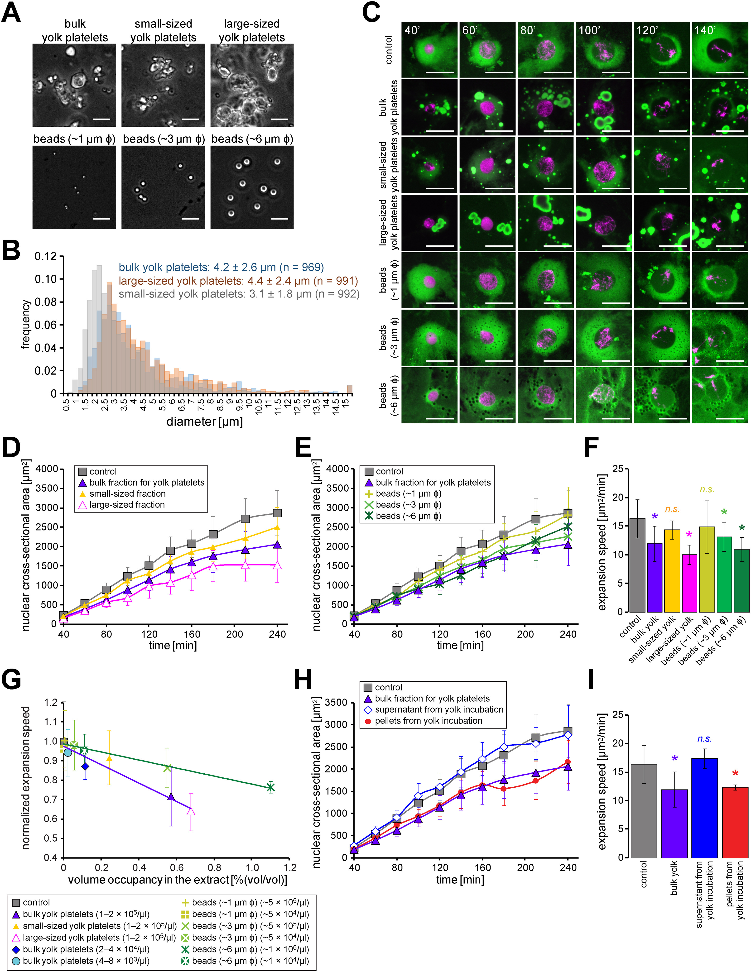 (A) Representative images of isolated yolk platelets in bulk fraction, small-sized fraction, large-sized fraction, and images of 1 âμm diameter magnetic beads, 3 âμm diameter magnetic beads, and 6 âμm diameter polystyrene beads. Scale bar: 10 âμm. (B) Diameter distributions of each fraction of yolk platelets. (C) Representative images of reconstructed nuclei in X. laevis egg extracts upon supplementation with either fraction for yolk platelets or artificial beads. DNA (magenta; stained using Hoechst33342) and membrane [green; stained using DiOC6(3)] were visualized in the fixed sample at the indicated time of incubation. Scale bar: 50 âμm. (D) Dynamics of the measured mean cross-sectional area in the reconstructed nuclei by supplementation with different-sized yolk platelets at a concentration of 1â2 âà â105/μl (control: n â= â16; bulk fraction for isolated yolk platelets: n â= â13; small-sized fraction: n â= â3; large-sized fraction: n â= â3). (E) Dynamics of the measured mean cross-sectional area in the reconstructed nuclei upon supplementation with each artificial bead [1 âμm diameter beads (â¼5 âà â105/μl): n â= â4; 3 âμm diameter beads (â¼5 âà â105/μl): n â= â6; 6 âμm diameter beads (â¼1 âà â105/μl)] or control [identical to those in panel D]. (F) Average expansion speed of nuclear cross-sectional area in the samples upon supplementation with yolk platelets or artificial beads. (G) Calculated expansion speed of the nuclear cross-sectional area was plotted against the volume occupancy of yolk platelets or artificial beads in the cytoplasmic extract. The calculated speed was divided by that of the control condition for each preparation. Each dataset upon supplementation with yolk platelets (purple) or artificial beads (green) is fitted using a linear regression. (H) Dynamics of the measured mean cross-sectional area and (I) expansion speed of cross-sectional area in the reconstructed nuclei upon supplementation with supernatant (n â= â3) or pellet (n â= â3) from pre-incubation of yolk platelets with extraction buffer. The data for control and supplementation with bulk yolk platelets are identical to panel D. âP â< â0.05, statistically significant difference and n.s., no significant difference with Wilcoxon test compared to the control condition. Average values (±SD) from each extract preparation were shown in each dataset.