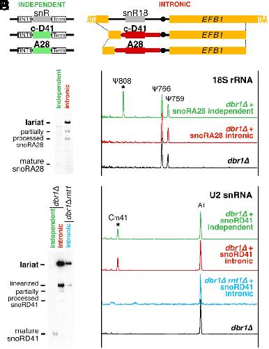 Ooi, Intronic snoRNA biosynthesis in Saccharomyces cerevisiae depends on the lariat-debranching enzyme: intron length effects and activity of a precursor snoRNA. 1998, Pubmed