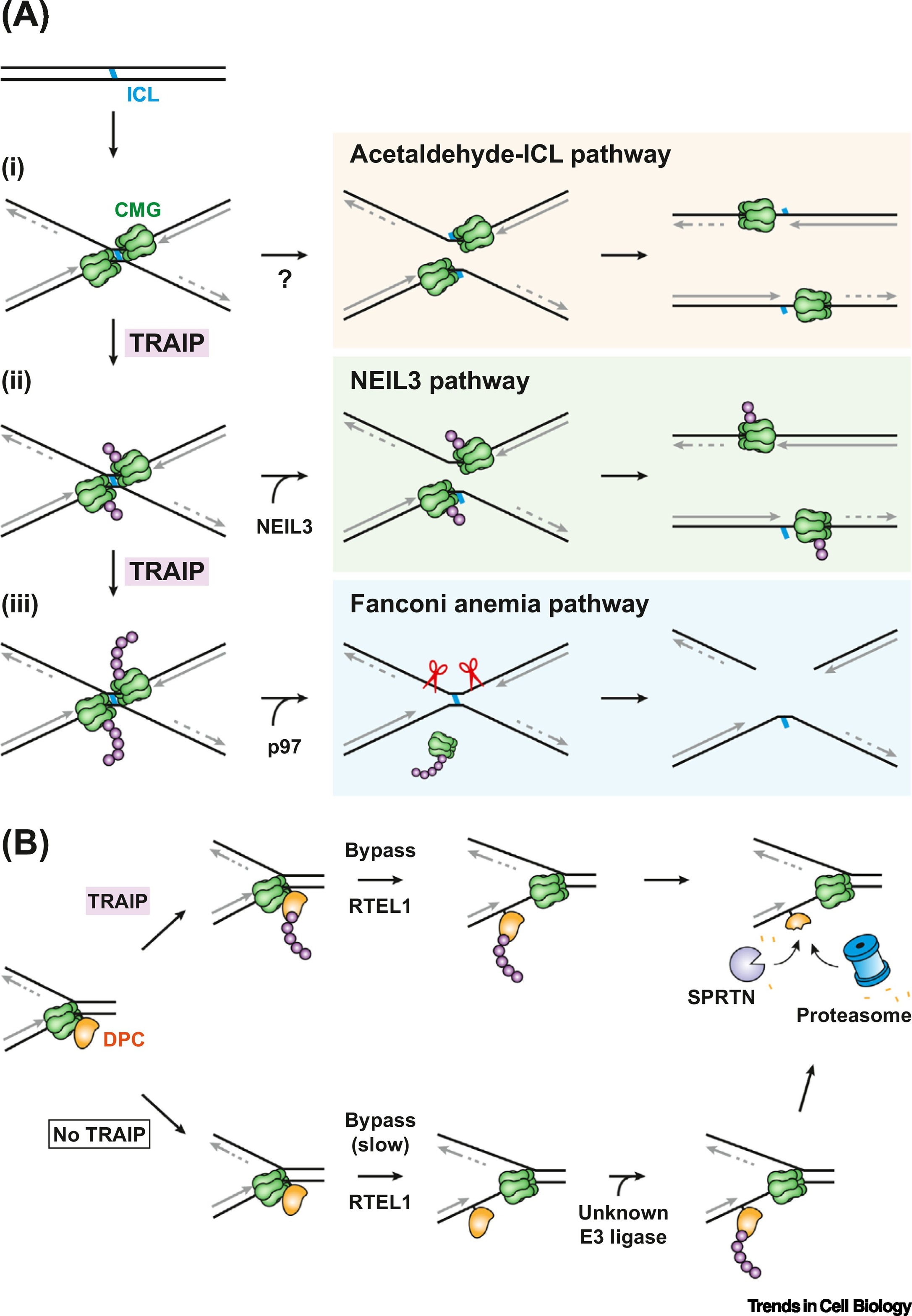 Figure 1. Replication-Coupled Interstrand Crosslink (ICL) and DNA-Protein Crosslink (DPC) Repair Pathways. (A) In Xenopus egg extracts, three pathways of ICL repair require the convergence of two replication forks at the crosslink. Fork convergence triggers ubiquitylation of the replisomeâs CDC45/MCM2-7/GINS (CMG) helicase by TRAF-interacting protein (TRAIP) (ubiquitin shown as purple spheres). Acetaldehyde-ICL repair is depicted as being initiated before CMG ubiquitylation (i), but this remains to be confirmed. Ubiquitin chains as short as one or two ubiquitins may recruit the NEIL3 glycosylase to directly unhook psoralen and abasic ICLs, allowing completion of DNA replication (ii). If NEIL3 fails to unhook the crosslink, TRAIP continues to extend the ubiquitin chains (iii). Long ubiquitin chains trigger CMG unloading by the p97 segregase, which allows Fanconi anemia pathway endonucleases to unhook the ICL. The resulting double-strand break is repaired by homologous recombination. (B) Proteins crosslinked to the leading strand template hinder progression of the CMG helicase. Upon fork collision, TRAIP ubiquitylates the DPC (top arrow). After the accessory helicase RTEL1 promotes CMG bypass of the lesion, the DPC is ubiquitylated by a second, unknown E3 ubiquitin ligase. DPC ubiquitylation marks the lesion for proteolysis by the proteasome. The DPC-specific protease SPRTN also contributes to proteolysis of both ubiquitylated and unmodified DPCs. Note that at DPC-fork collisions, TRAIP activity does not require fork convergence and CMG is not ubiquitylated. In the absence of TRAIP, the initial ubiquitylation of the DPC is delayed, as is CMG bypass, but bypass does eventually occur, followed by CMG ubiquitylation by an unknown E3 ubiquitin ligase and proteolysis by SPRTN and the proteasome. |