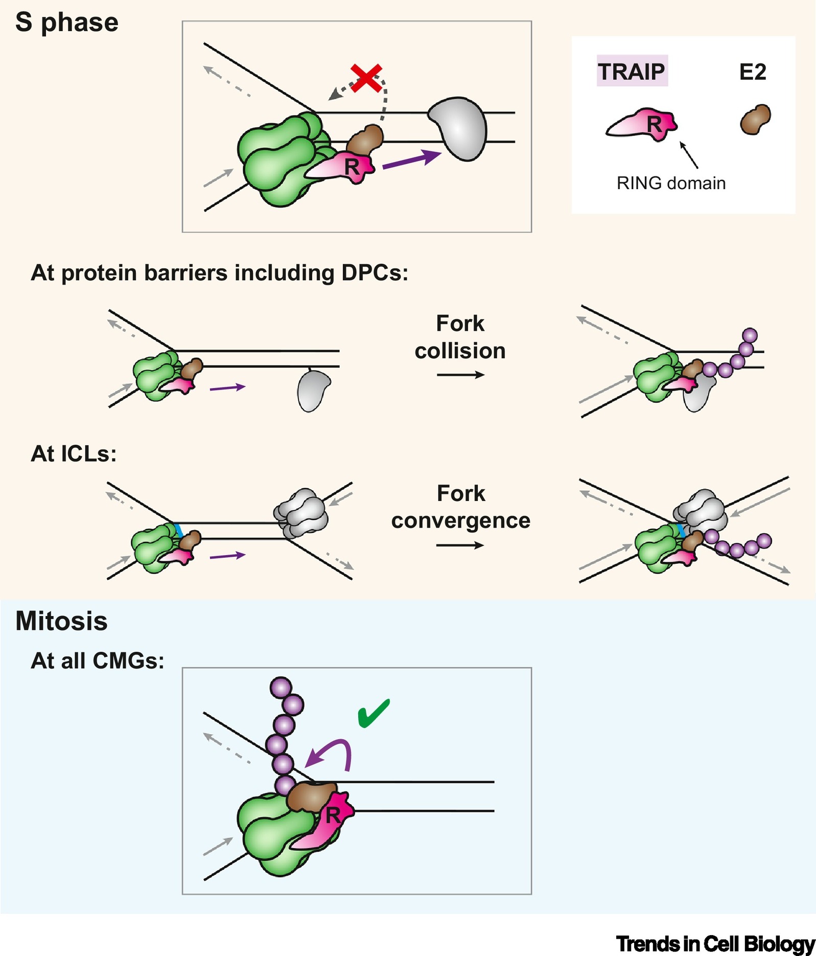 Figure 2. Model for TRAF-Interacting Protein (TRAIP) Function in S Phase. During unperturbed DNA replication in S phase, TRAIP is assembled with the replisome with its RING domain positioned to ubiquitylate any protein encountered by the replisome (inset; purple arrow signifies direction of ubiquitylation). Such proteins include DNA-protein crosslinks (DPCs) and CDC45/MCM2-7/GINS (CMG) helicases when forks converge at interstrand crosslinks (ICLs) (‘S phase’, center, gray). TRAIP ubiquitylation of the host replisome on which it is assembled (‘S phase’, inset, gray broken arrow) does not occur, possibly because rigid positioning of the RING domain prevents it from bringing its E2 ubiquitin conjugating enzyme (brown) into contact with CMG. During mitosis, TRAIP undergoes a conformational change, allowing it to ubiquitylate its host CMG (‘mitosis’, purple arrow). |