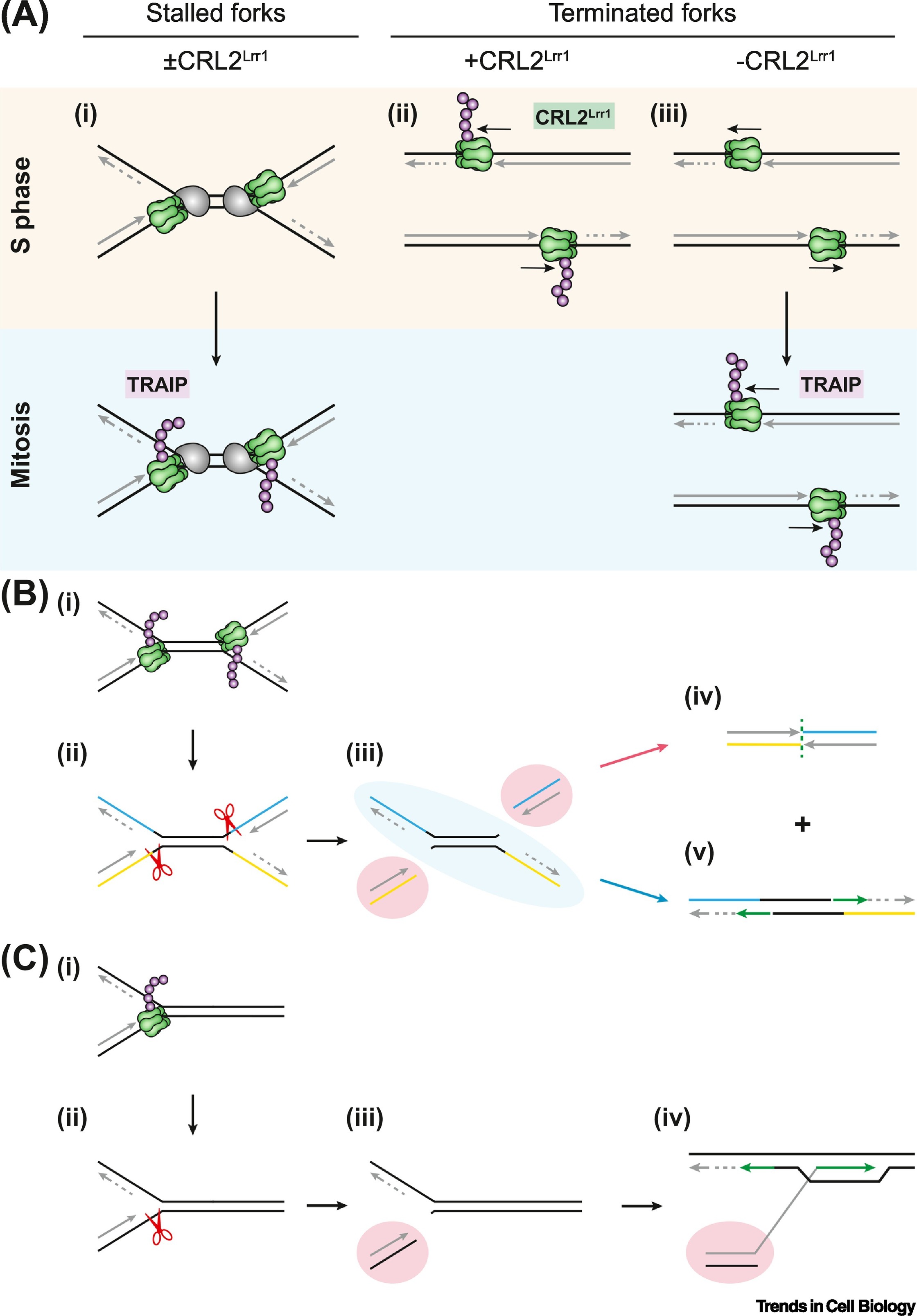 Figure 3. Cell Cycle Regulation of TRAF-Interacting Protein (TRAIP) Specificity. (A) (i) During S phase, the CDC45/MCM2-7/GINS (CMG) helicases of stalled but unconverged replisomes are not ubiquitylated. However, if these stalled CMGs persist into mitosis, they undergo TRAIP-dependent ubiquitylation and subsequent unloading by p97. (ii) Terminated CMGs are normally ubiquitylated in S phase by the Cul2-based RING E3 ubiquitin ligase CRL2Lrr1. (iii) In the absence of CRL2Lrr1, terminated CMGs remain unmodified and persist on chromatin until mitosis, when they are ubiquitylated by TRAIP and unloaded. (B) (i) During mitosis, CMGs stalled at the boundaries of a common fragile site are ubiquitylated by TRAIP. (ii) Ubiquitylated CMGs are unloaded, which exposes the leading strand templates of the two forks to structure-specific endonucleases such as MUS81-EME1. (iii) Cleavage of the leading strand templates results in two broken ends (highlighted in red) and an intact strand (highlighted in blue). The two broken ends are repaired by end joining (iv), while the intact strand is restored by gap filling (green arrows) (v). These two repair processes result in the deletion of the unreplicated DNA and sister chromatid exchange, which are hallmarks of common fragile site expression. (C) If a chromosome containing a stalled fork enters mitosis in the absence of a nearby converging fork (e.g., at a telomere) (i), TRAIP-mediated mitotic CMG unloading (ii) leads to leading strand template cleavage and a single-ended double-strand break (highlighted in red) (iii). This break could then be repaired by break-induced replication (iv). |