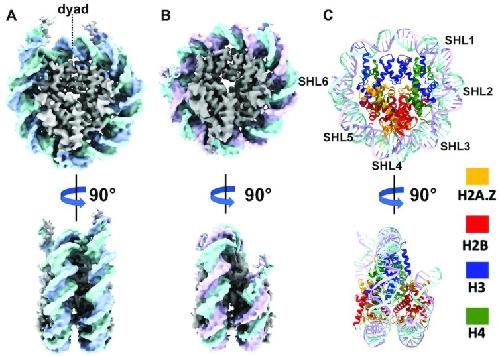 Figure 1. Cryo-EM structures reveal flexible DNA terminus in H2A.Z nucleosomes. (A) Cryo-EM density map of the canonical nucleosomes at 3.8 Å resolution: disc view (top) and side view (bottom). (B) Cryo-EM map of H2A.Z nucleosome at 3.7 Å resolution: disc view (top) and side view (bottom). (C) Atomic model of H2A.Z nucleosome: disc view (top) and side view (bottom).