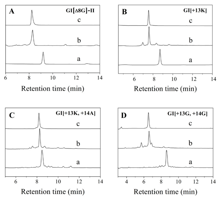 Figure 1. HPLC analyses of one-step folding products of linear GI variants. (A) GI[ΔG8]-II. (B) GI[+13K]. (C) GI[+13K, +14A]. (D) GI[+13G, +14G].Traces from bottom to top: linear peptide (a), folded products (b), purified products (c). Samples were applied to an Agilent Eclipse Plus C18 column (5 μm, 4.6 mm×250 mm) and eluted with a linear gradient of 5–10% B for 0–1 min; 10–50% B (B is acetonitrile containing 0.1% trifluoroacetic acid (TFA)) for 1–25 min. Absorbance was monitored at 214 nm. Flow rate was 1.0 mL/min.