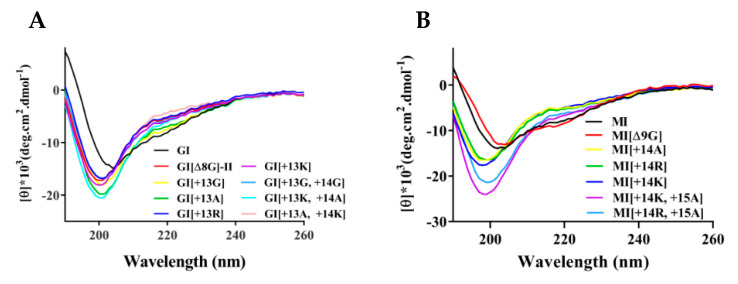 Figure 3. Circular dichroism spectra of α-conotoxins and their variants in 0.01 M PBS (pH = 7.2). (A) GI mutants. (B) MI mutants. n = 3.