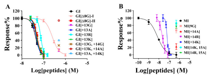 Figure 4. Concentration-dependent response curves of the GI and MI variants interacting with rat muscular nAChRs. (A) GI variants; (B) MI variants. The error bars for the data denote the SEM. Five to seven oocytes were used for each determination. The IC50 values and 95% confidence intervals are summarized in Table 1.