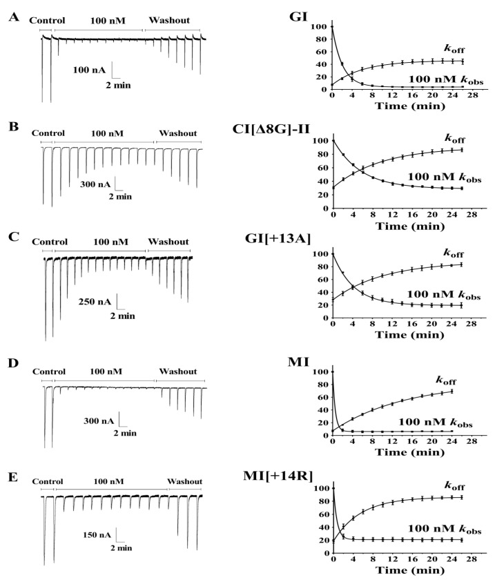Figure 5. Kinetic analyses of GI and MI variants interacting with Xenopus oocyte-expressed rat muscular nAChRs. (A) GI, (B) GI[∆8G], (C) GI[+13A] (D) MI, (E) MI[+14R]. The toxins were applied as described in Materials and Methods, and the data were fit to a single exponential equation. The error bars denote the SEM of the data obtained using four to seven oocytes for each determination. The kinetic data are summarized in Table 2.