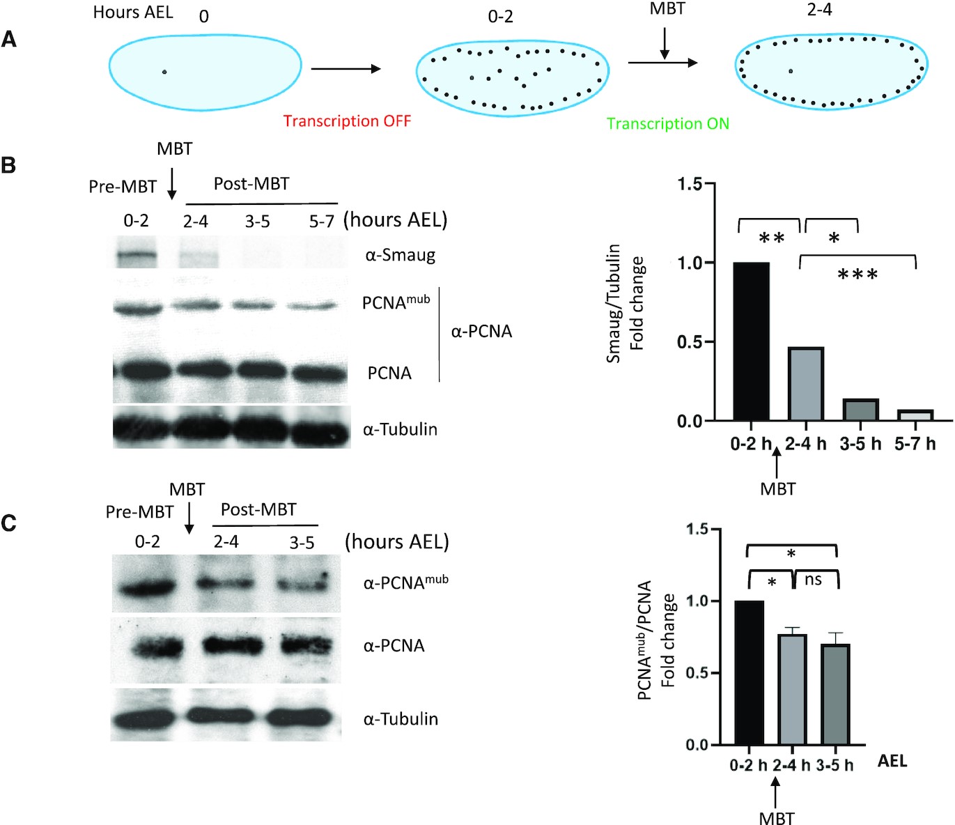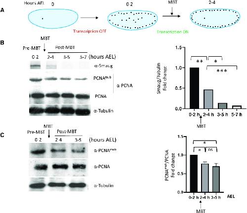 Figure 3. Developmental regulation of PCNAmUb in Drosophila. (A) Simplified scheme of early D. melanogaster embryogenesis. Embryos were collected at different hours after eggs laying (AEL), pre-MBT (0–2 h), MBT (2–4 h) and post-MBT (3–5 and 5–7 h). (B, C) Left panels: western blot of total Drosophila embryo extracts analyzed at the indicated times with the indicated antibodies; right panels: quantification of western blot panels. Data are presented as means ± SD, n = 2. Means were compared using unpaired Student’s t-test. |