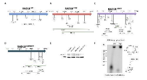 Supplementary Figure S3. Mutations map of lacZ co-injected with RAD18 mRNAs (A-D) Mutations map of the lacZ gene recovered from pre-MBT embryos co-injected with the indicated Rad18 forms (n=3). (E) Western blot of 16-cell Xenopus embryos protein extracts with either a PCNAmUb- or a PCNA-specific antibody expressing the indicated Rad18 variants. (F) High level of ribonucleotides incorporation during DNA synthesis at low DNA-tocytoplasmic ratio. Autoradiograph of radioactive-labeled M13 ssDNA replicated in egg extracts at different doses: low (0.66 ng/µL-1) for pre-MBT-like or high DNA-to-cytoplasmic ratio (6.6 ng/ µL-1) for post-MBT-like dose, treated with NaOH and separated by denaturing urea-gel electrophoresis. Products were compared with DNA ladder of know size (n=2). |