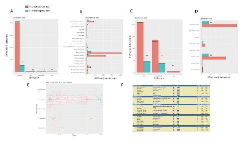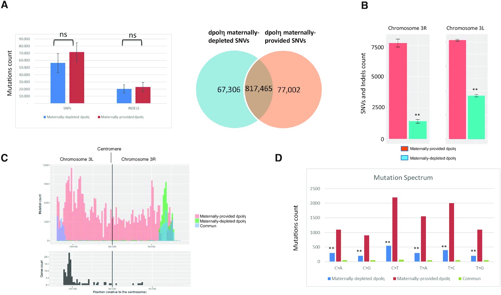 Figure 5. Chromosome-specific variation in SNVs in the absence of maternal dPolη (A, left panel) SNVs and indel abundance in WGS sequenced adult flies either maternally depleted or maternally provided of dPolη. Right panel: diagram displaying how many counted SNVs on the indicated fly genomes are mutual or distinct. The graph represents the average of two sequenced flies per condition. Data are presented as means ± SD. No statistical significant difference was detected for either SNVs or indels (unpaired Student’s t-test). (B) Chromosome 3L (left panel) and 3R (right panel) SNV rates of maternally provided (red bars) or maternally depleted (green bars) dpolη male adult flies. SNV means of two independent WGS analyses are expressed as counts in the columns. Data are presented as means ± SD. Means were compared using unpaired Student’s t-test (n = 2). (C) SNV graphic representation (mutation count) in the pericentromeric region of either the left portion (3L) or right portion (3R) of chromosome 3. SNVs found only in either maternally depleted or maternally provided dPolη progeny are shown, respectively, in orange or green, while common SNVs are illustrated in blue. Lower panel: graphic representation of gene density (gene count) along the indicated chromosome regions (n = 2). (D) Mutation spectrum on chromosome 3, where x-axis indicates types of nucleotide variants and y-axis indicates the quantity of counted SNVs. Unique polymorphism in either maternally depleted or partially maternally provided dPolη progeny is separately represented in blue or in red, while mutual variants are displayed in green. Means were compared using unpaired Student’s t-test (n = 2). |