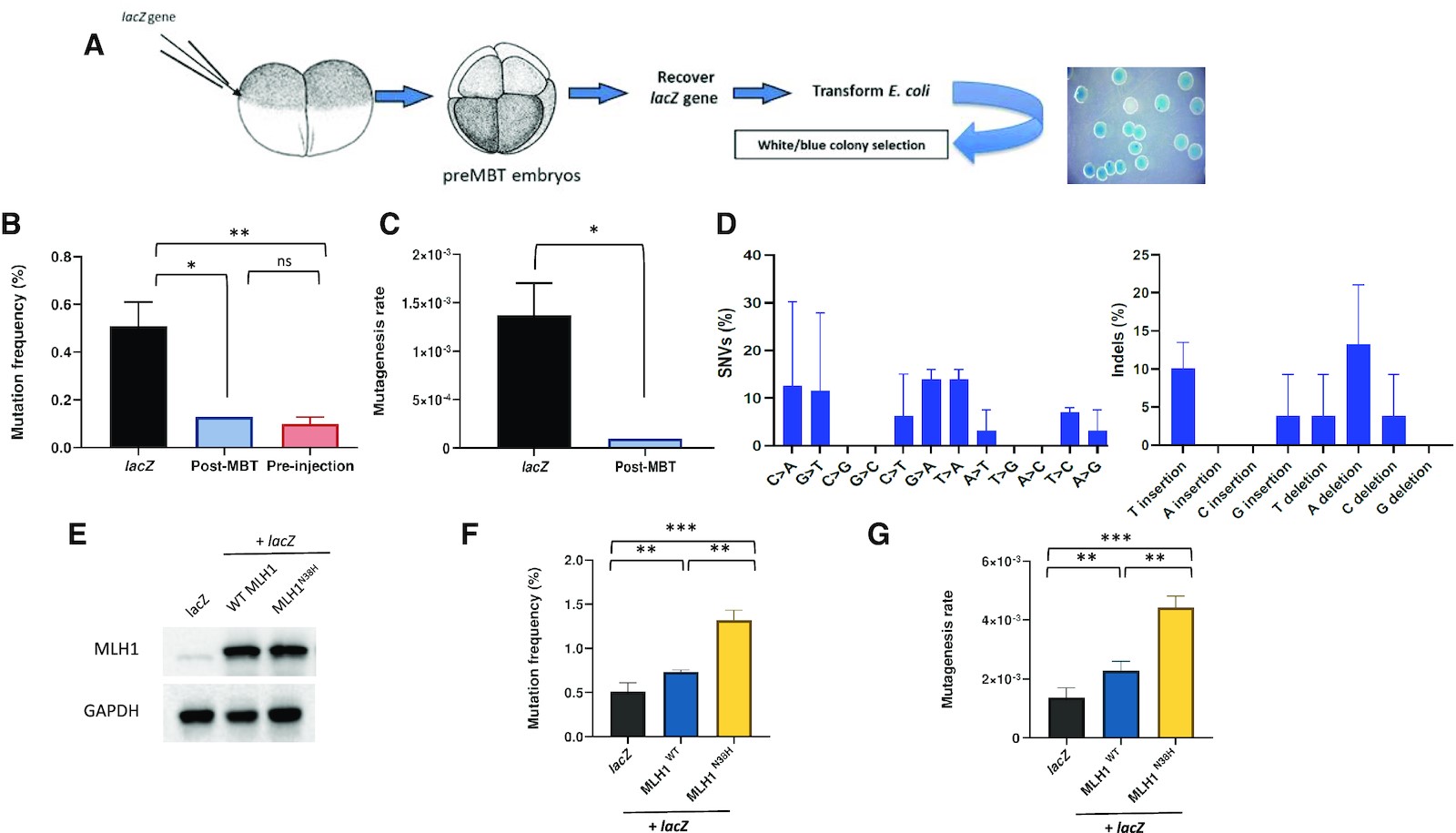 Figure 1. Pre-MBT Xenopus embryos accumulate polymorphisms and deletions. (A) Drawing of the experimental strategy adopted to analyze mutagenesis in X. laevis embryos. Two-cell-stage embryos are injected with a supercoiled plasmid containing lacZ reporter gene (pEL1) and allowed to replicate for further three divisions. After embryo collection, plasmid DNA is extracted and transformed in lacZ-deficient bacteria for white/blue screening. (B) Mutation frequency expressed as a percentage of white colonies in each condition. The mutation frequency of lacZ recovered from embryos injected with a post-MBT amount of plasmid DNA is also included as comparison. Pre-MBT and post-MBT, n = 3; pre-injection, n = 2. (C) Mutagenesis rate in the indicated different experimental conditions expressed as mutations per base pair/locus per generation (see the ‘Materials and Methods’ section), normalized to the pre-injection background values (n = 3). (D) Mutation spectra of the lacZ gene recovered from Xenopus pre-MBT embryos after Sanger sequencing (n = 3). (E) Western blot of total protein extracts obtained from Xenopus embryos subjected to the indicated experimental conditions (n = 2). (F) Mutation frequency and (G) mutagenesis rate of lacZ isolated from Xenopus embryos injected as indicated. lacZ, n = 3; Mlh1, n = 2. Data are presented as means ± SD. Means were compared using unpaired Student’s t-test. |