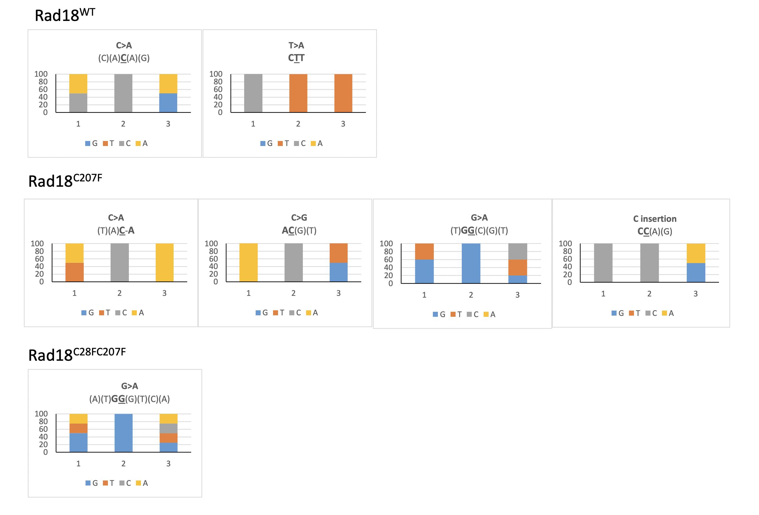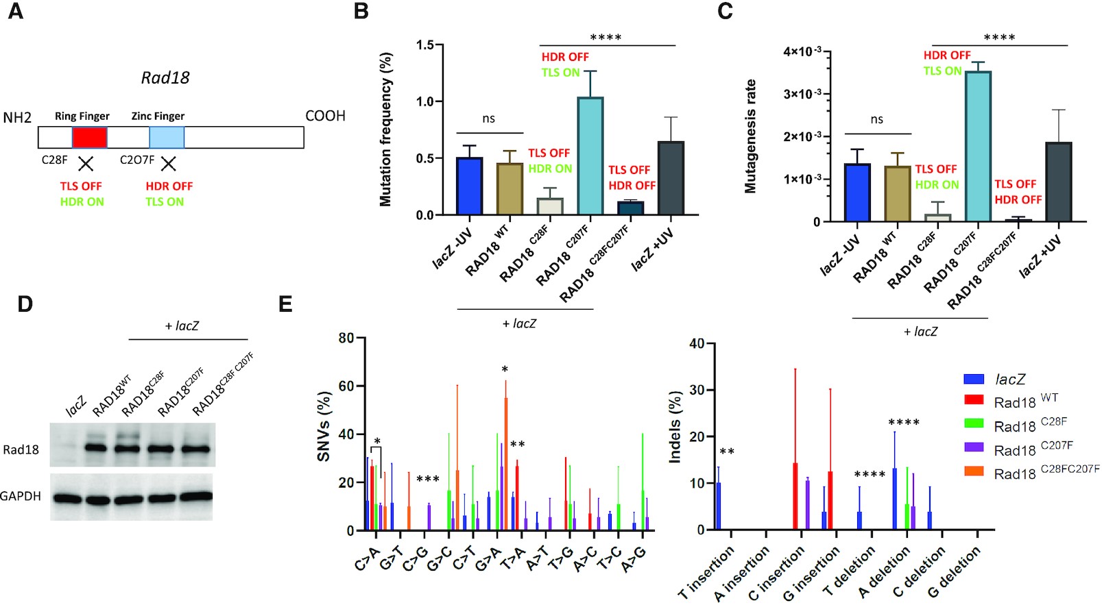 Figure 2. Differential contribution of Rad18 to mutagenesis in pre-MBT Xenopus embryos. (A) Schematic illustration of Rad18 domains in DNA damage tolerance and repair. TLS depends on the ring finger domain, while HDR is dependent on the zinc finger domain. The C28F mutation knocks out TLS activity (TLS OFF), while the C207F mutation knocks out HDR activity (HDR OFF). (B) Mutation frequency and (C) mutagenesis rate (measured as described in Figure 1) of lacZ recovered from embryos co-injected with the indicated RAD18 mRNAs, or lacZ injected alone. The mutation frequency of lacZ recovered from embryos injected with a post-MBT amount of plasmid DNA (post-MBT) is also included as comparison. RAD18WT and RAD18C28F, n = 3; RAD18C207F and RAD18C28FC207F, n = 2. (D) Western blot of total protein extracts obtained from Xenopus embryos subjected to the indicated experimental conditions (n = 3). (E) Mutation spectrum of lacZ recovered from embryos injected with the indicated RAD18 variants, or lacZ injected alone. Data are presented as means ± SD. Means were compared using analysis of one-way ANOVA, followed by unpaired Student’s t-test. |