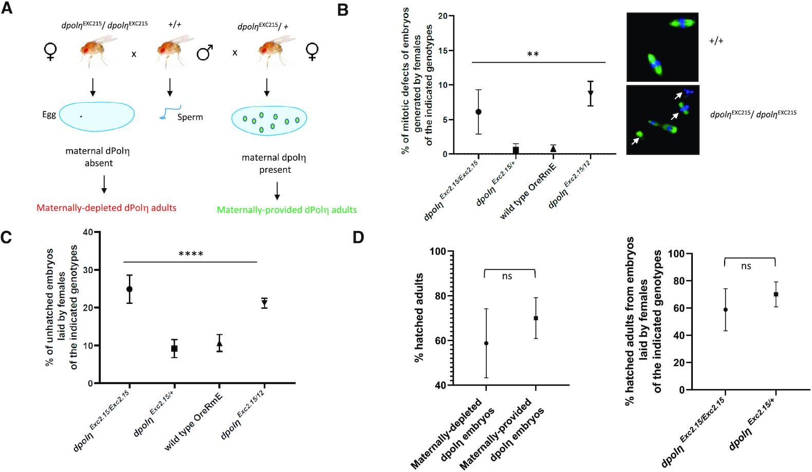 Figure 4. Absence of maternal dPolη decreases embryo’s hatching rate. (A) Drawing of the experimental plan employed to evaluate the importance of dPolη during Drosophila early embryogenesis. In this experimental setup, dPolη is provided only after MBT upon zygotic gene activation. (B) Left panel: quantification of embryos displaying mitotic defects (n = 2); right panel: representative images of mitotic defects observed in either wild-type (+/+) or maternally depleted (dpolηExc2.15/dpolηExc2.15) flies. Data are presented as means ± SD. Means were compared using analysis of one-way ANOVA. (C) Statistical analysis of embryo-to-larva hatching rate of Drosophila embryos laid by mothers bearing the indicated dpolη genotypes. Embryos were collected over 12 h and incubated at 25°C for 2 days before calculating hatching rate. Means and standard deviation of unhatched embryos are expressed as error bars. Means were compared using analysis of one-way ANOVA followed by unpaired Student’s t-test for the first panel (from left to right) and Fisher’s exact test for the second panel (n = 3). (D) Statistical analysis of larva-to-adult transition hatching rate in the absence (maternally depleted) or presence (maternally provided) of maternal dPolη (left panel), and comparison between two different dpolη mutants (right panel). Data are presented as means ± SD. Means were compared with unpaired Student’s t-test (n = 3). |