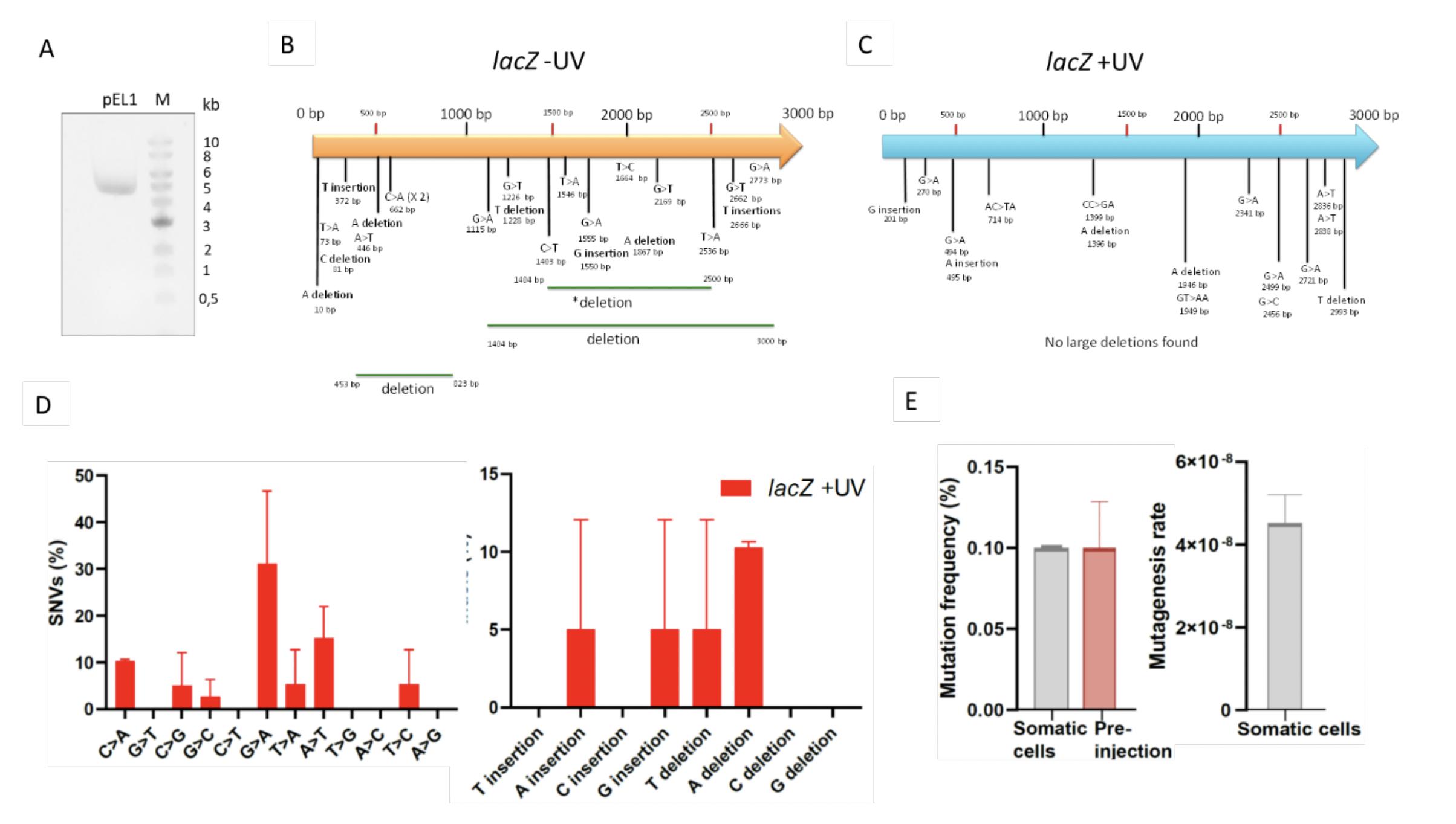 Supplementary Figure S1. Mutation maps and SNVs in early Xenopus embryos (A) Agarose gel electrophoresis of lacZ-containing plasmid (pEL1). M indicates DNA ladder molecular weight marker. (B-C) Mutations map (SNVs, insertions, deletions) on the lacZ gene recovered from pre-MBT embryos irradiated (+UV) or not (lacZ) with UV-C (n=3). (D) Mutation spectra of UV-irradiated lacZ gene recovered from Xenopus pre-MBT embryos after Sanger sequencing. Data are presented as means ± SD (n=2). (E) Mutation frequency (left panel) and rate (right panel) of cultured somatic A6 Xenopus cells. Mutagenesis rate is expressed as mutations per base pair/locus per generation (see Materials and Methods), normalized to the pre-injection background values. Data are presented as means ± SD (n=2). |