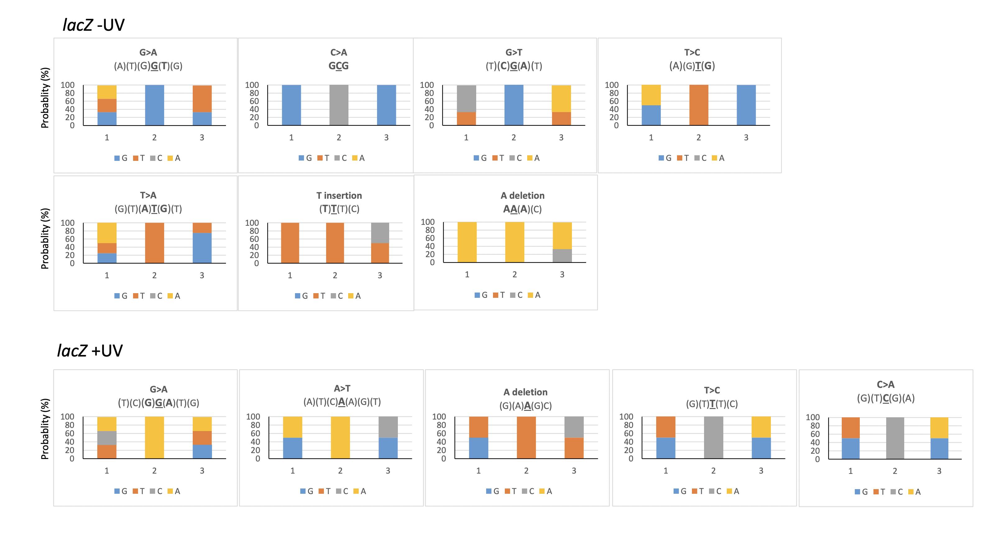 Supplementary Figure S2. Analysis of SNVs dinucleotide environment generated on a plasmid bearing the lacZ reporter gene not irradiated (-UV) or irradiated (+ UV) with UV-C recovered from Xenopus early embryos. The histogrammes represent the probability to find the indicated base at the positions immediately 5’ (position 1) end 3’ (position 3) of the SNV (position 2). A consensus is indicated above each histogram. Slashs separate alternate bases at each position while hyphens separate bases. DNA bases in bold highlight most abundant base at that position. Underlined and bold bases indicate the position where the change has occurred. |