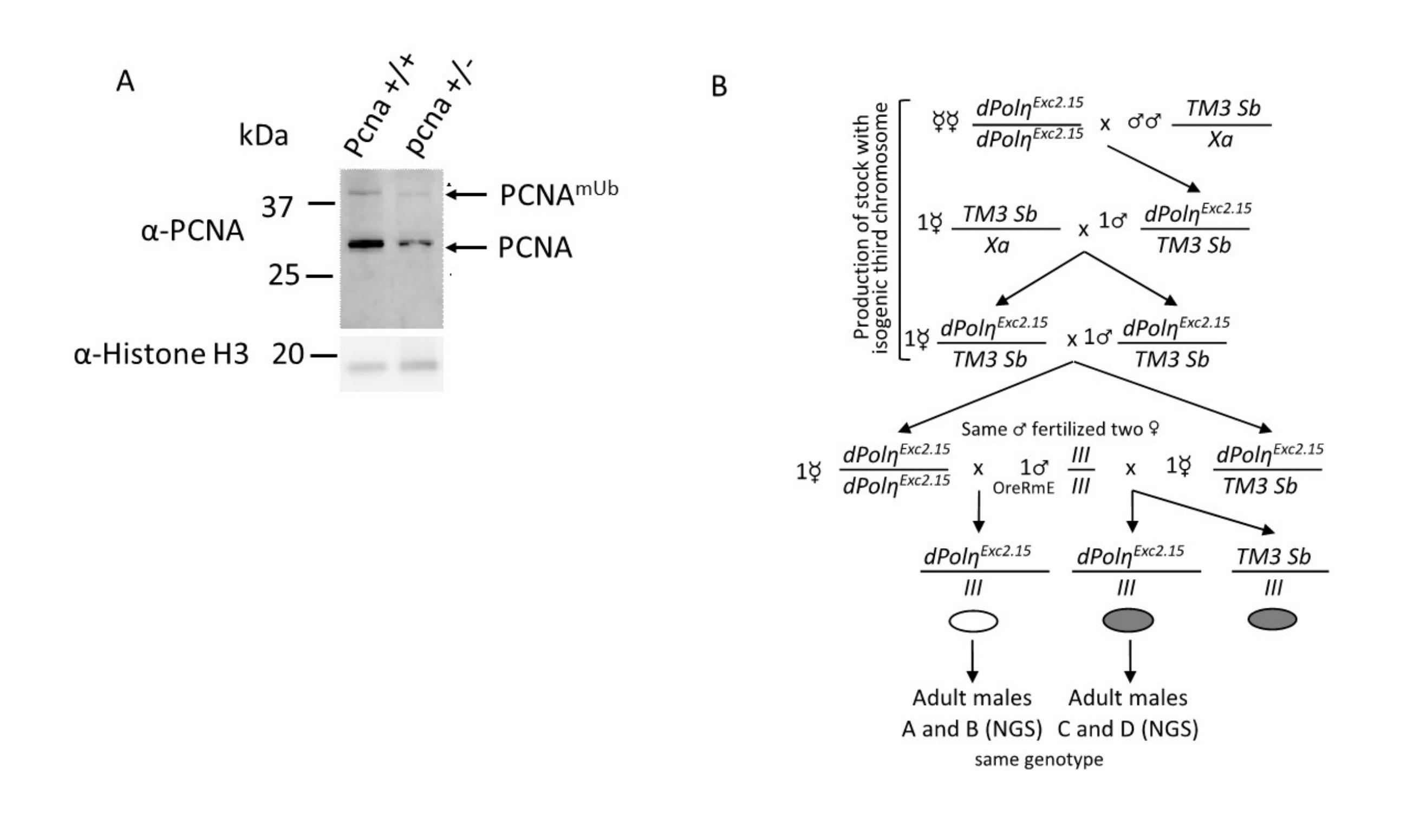 Supplementary Figure S5. PCNA detection in Drosophila and genetic crosses used to generate maternally-depleted dpolη flies (A) Western blot of total protein extracts obtained from flies of the indicated genotype with the PC10 antibody (n=2). (B) Genetic crosses set up to generate either maternally-depleted or maternally-provided dPolη adult flies. The first two crosses generated a balanced stock over TM3 marked with Sb with a isogenic 3rd chromosome carrying the dpolηExc2.15 mutation. From this stock, one homozygous (left) and one hetreozygous (right) virgin females were collected and mated with the same wild type male, to produce embryos which were respectively depleted or not of maternal deposited dPolη. Then, genotypically identical adult males, devoid of the Sb marker, and containing the isogenic 3rd chromosome carrying the dpolηExc2.15mutation, were collected for WGS processing and analysis. |