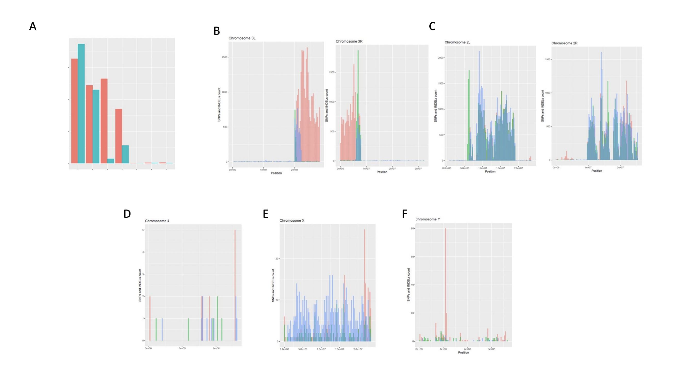 Supplementary Figure S6. Distribution of mutations in the absence of maternal dpolη across chromosomes (A) SNVs and Indels count on the indicated Drosophila melanogaster chromosomes. (B-F) Mean of SNVs and Indels distribution on the indicated Drosophila chromosomes (n=2). The x-axis describes the position of counted variants on the chromosome and y-axis displays how many variants were counted on that position. Means were compared with an unpairedtwo tailed Student’s t test. |
