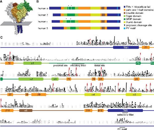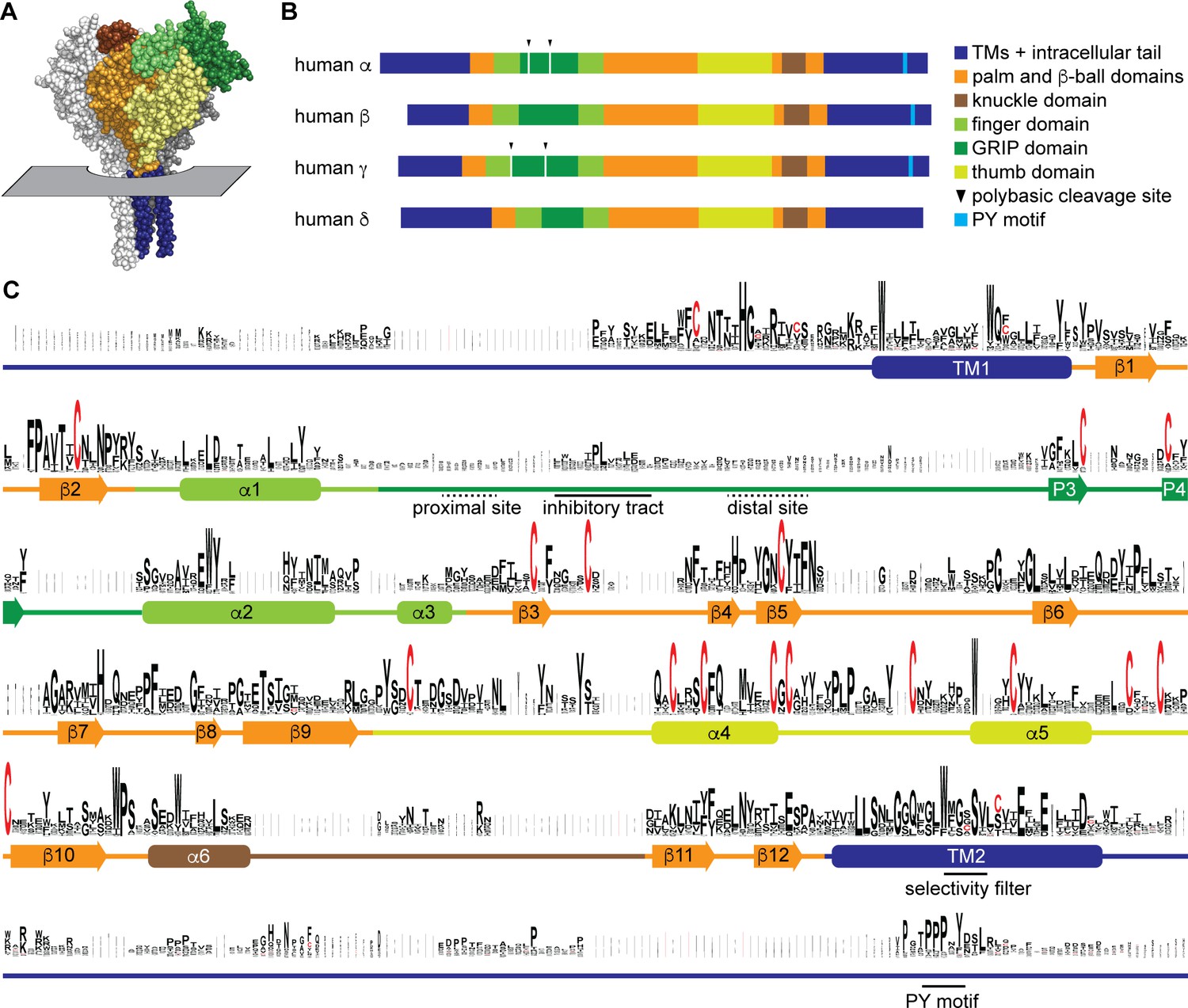 Figure 1. Sequence conservation in epithelial Na+ channel (ENaC) subunits. (A) Space filling model of ENaC (pdb code: 6BQN) with plane indicating position of outer membrane border. The α and γ subunits are white and gray, respectively. The β subunit is colored by domain as indicated in panel B. Intracellular structures are absent in this structural model. (B) Linear model of human ENaC subunits showing domain organization and highlighting position of polybasic cleavage sites and PY motifs. (C) Sequences (Supplementary file 1) were aligned using MUSCLE (Edgar, 2004; Figure 1âsource data 1). Residue symbol sizes are proportional to frequency at a given position. Key features in the sequence are indicated, as are the approximate position of α helices (rounded rectangles) and β-strands (arrows). Colors correspond to protein domains, as indicated in panel B. The GRIP (gating release of inhibition by proteolysis) domain is unique to ENaC subunits in the ENaC/Deg family. The P1 and P2 β-strands in the GRIP domain are not indicated, but are likely near the inhibitory tract and distal site, respectively, if present. |