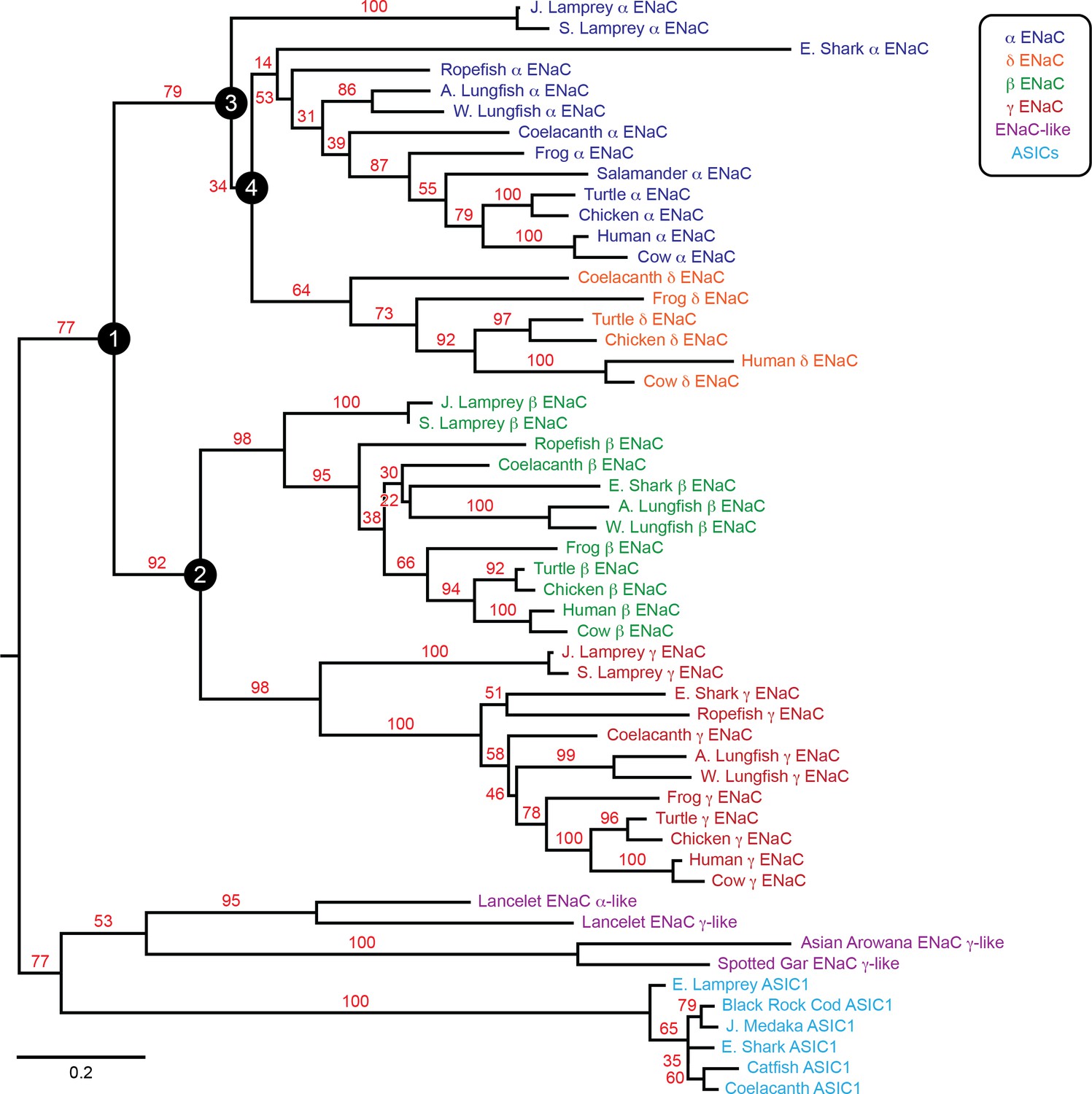 Figure 2. Phylogenetic tree of epithelial Na+ channel (ENaC) subunits. Maximum likelihood tree calculated from ENaC subunit sequences of marine species and select terrestrial vertebrates, and ENaC-related proteins. Branch support bootstrap values are shown. Scale bar indicates the number of substitutions per site. Key ancestral nodes are indicated by circled numbers. A. Lungfish = Australian Lungfish, E. Shark = Elephant Shark, E. Lamprey = European River Lamprey, J. Lamprey = Japanese Lamprey, J. Medaka = Japanese Medaka, S. Lamprey = Sea Lamprey, W. Lungfish = West African Lungfish. |