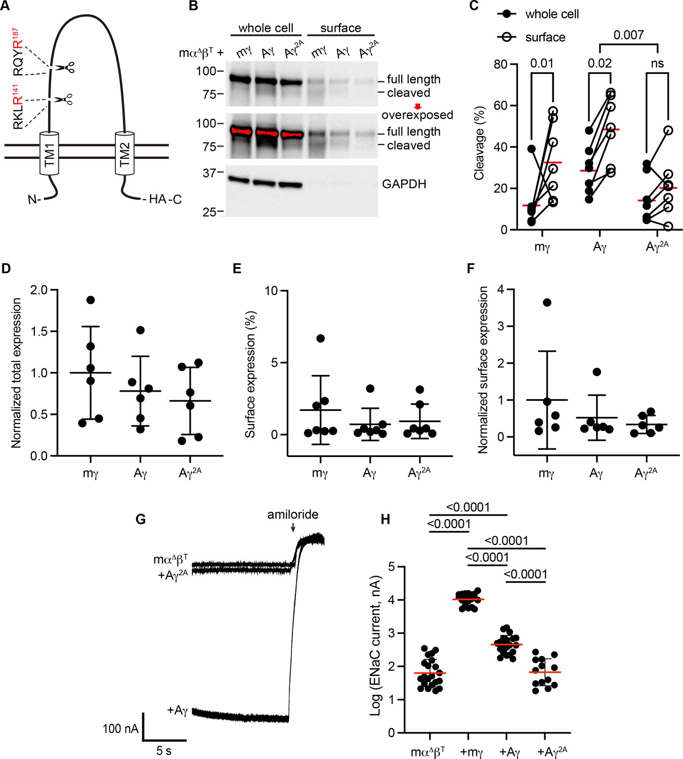 Figure 3. Predicted cleavage sites in the epithelial Na+ channel (ENaC) γ subunit from Australian lungfish are functional. (A) Schematic of Aγ topology. Aγ has two predicted furin cleavage sites in its extracellular GRIP (gating release of inhibition by proteolysis) domain. All γ subunits were labeled with C-terminal epitope tags to facilitate detection of full-length subunits and the larger of the cleaved fragments. (B) Xenopus oocytes were injected with cRNAs encoding mαâ, mβT, and hemagglutinin (HA)-tagged γ subunits, as indicated. One day after injection, whole cell lysates and cell surface isolates were blotted and probed for HA and glyceraldehyde-3-phosphate dehydrogenase (GAPDH). Full-length and cleaved bands are indicated and band densities were quantified. An overexposed blot is shown to highlight cell surface bands. Over exposed areas are red. (C) Cleavage %, calculated as cleaved/(cleaved + full length) à 100 is shown. Data were analyzed by repeated measures two-way analysis of variance (ANOVA) with Å idákâs multiple comparison test. p values are shown for indicated comparisons. Cleavage was also greater for Aγ than for mγ (p = 0.05). (D) Normalized total expression was calculated by normalizing the sum of full-length and cleaved bands to the mean of mγ after normalizing each sample for loading based on GAPDH from the same blot. (E) Surface expression % was calculated using band densities adjusted for the fraction of the respective sample loaded. (F) Normalized surface expression was calculated by multiplying values from the same sample in D and E, and then normalizing to the mean of mγ. Data in DâF were analyzed by one-way ANOVA with Tukeyâs multiple comparison test. No significant differences between groups were found. Note that due to the lack of GAPDH data for one blot, the number of replicates for D and F (n = 6) is one fewer than for C and E (n = 7). (G) Whole cell currents were measured in injected oocytes by two-electrode voltage clamp, with voltage clamped at â100 mV. Representative traces of indicated subunit combinations are shown. Currents were continuously recorded in a bath solution containing 110 mM Na+. The ENaC-blocking drug amiloride (100 µM) was added at the end of each experiment to determine the ENaC-mediated current. (H) Log-transformed amiloride-sensitive inward currents are plotted, and were analyzed by one-way ANOVA followed by Tukeyâs multiple comparison test. p values for comparisons where p < 0.05 are shown. Bars indicate mean values; errors shown are standard deviation (SD). |