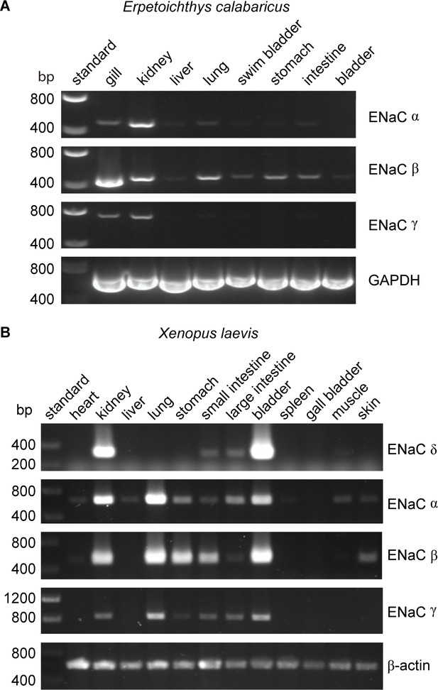 Figure 4. Tissue distribution of (A) Erpetoichthys calabaricus (ropefish) and (B) Xenopus laevis epithelial Na+ channel (ENaC) subunit transcripts by reverse transcription-PCR (RT-PCR). cDNA libraries were generated from tissue homogenates. PCR reactions were performed using primers indicated in Supplementary file 3. Figure 4âsource data 1 Uncropped gels are shown with bands at the target size for a given primer pair indicated. https://cdn.elifesciences.org/articles/75796/elife-75796-fig4-data1-v2.zip Download elife-75796-fig4-data1-v2.zip |