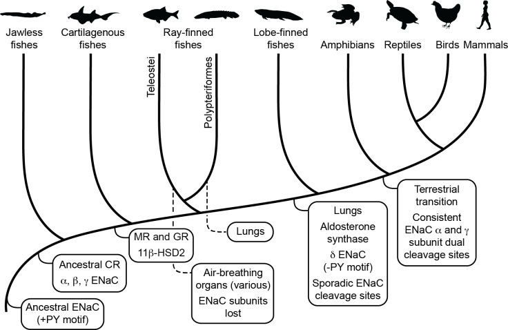 Figure 5. Schematic view of evolution of aldosterone signaling, air-breathing organs, epithelial Na+ channel (ENaC), and ENaC regulatory motifs.ENaC subunits were not found in nonvertebrate chordates or in teleosts. The ancestral ENaC subunit likely had a PY motif and was a substrate for Nedd4-2-dependent regulation. Like mammalian ENaC α subunits, the ancient ENaC subunit may have formed functional homotrimers, or may have formed channels with other ENaC paralogs. ENaC α, β, and γ subunits appeared before the emergence of jawless fishes, whereas ENaC δ subunits first appeared in an ancestor of the lobe-finned coelacanth. Proteins required for aldosterone signaling (mineralocorticoid receptor [MR], 11β-hydroxysteroid dehydrogenase [11β-HSD2], and aldosterone synthase) evolved before the emergence of tetrapods. Lungs appeared in lobe-finned fishes on the lineage to tetrapods. Air-breathing organs (e.g., respiratory gas bladders and labyrinth organs) evolved independently in ray-finned fishes, including morphologically distinct lungs in Polypteriformes. Individual GRIP (gating release of inhibition by proteolysis) domain ENaC cleavage sites first appeared sporadically in marine species. Dual cleavage sites appeared consistently in the ENaC α and γ subunits in terrestrial vertebrates. CR, corticoid receptor; GR, glucocorticoid receptor. Animal silhouettes courtesy of PhyloPic (http://www.phylopic.org). |