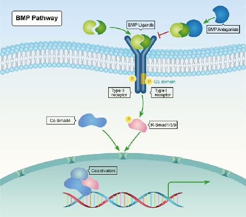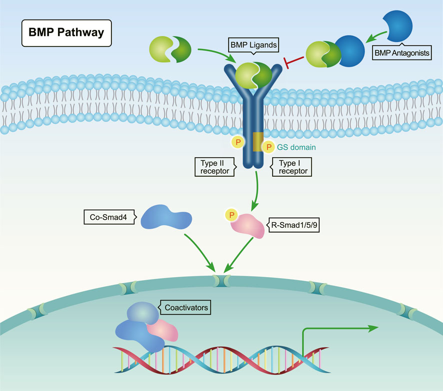 FIGURE 1. Canonical BMP signaling pathway. BMP ligands (yellow and green) bind to type II serine-threonine kinase receptors, which recruit and phosphorylate type I receptors. Upon phosphorylation by type I receptors, Receptor-regulated Smads (R-Smads, Smad1/5/8) form complexes with Co-Smad (Smad4), and then translocate into the nucleus to regulate the transcription of target genes through interactions with transcriptional co-regulatory factors. |