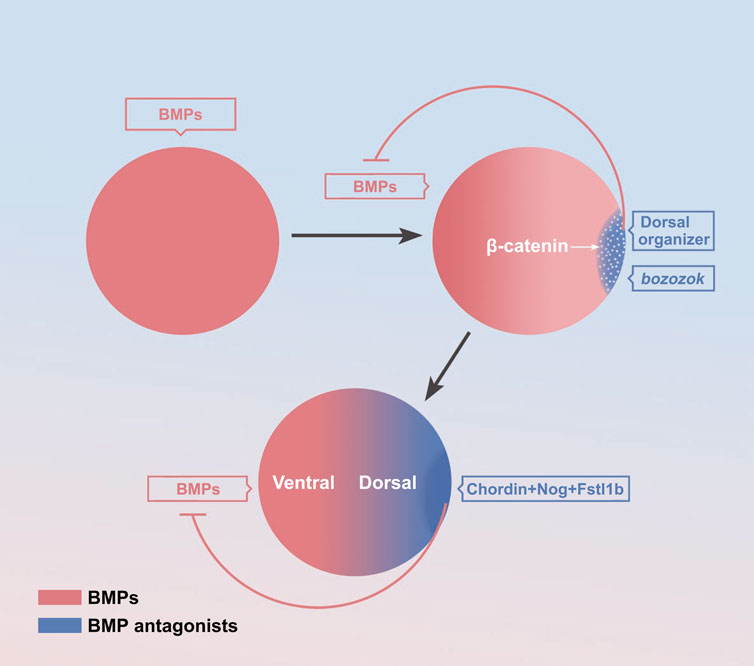 FIGURE 2. The formation of the BMP signaling gradient. The maternal factors activate zygotic activation of BMP (Schier and Talbot, 2001; Shieh et al., 2014; Kobayashi et al., 2018; Zhang et al., 2020). Activation of bozozok on the dorsal organizer (Goutel et al., 2000; Schier and Talbot, 2001; Leung et al., 2003; Sidi et al., 2003; Ro and Dawid, 2009; Irizarry and Stathopoulos, 2021) Activation of BMP inhibitors on the dorsal organizer (Cha et al., 2008; Hikasa and Sokol, 2013; Bier and De Robertis, 2015; Ding et al., 2017). |