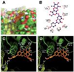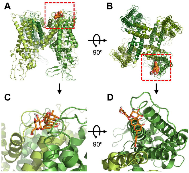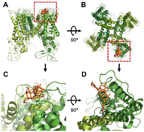 Figure 4. Molecular docking modeling of naringin to TRPV1: (A) side views of the docked naringin in complex with TRPV1. (B) Top views of the docking model. (C) An enlarged view of the red dotted line in Figure 4A. (D) An enlarged view of the red dotted line in Figure 4B.