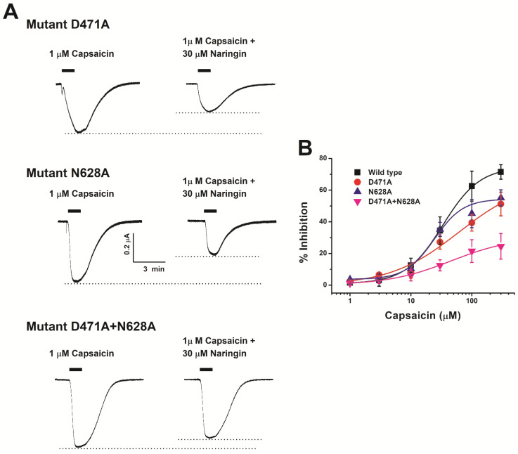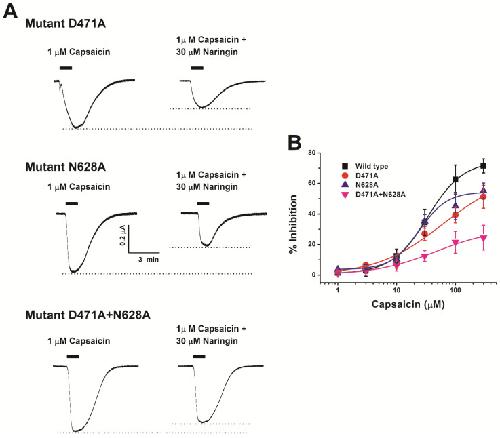 Figure 6. Comparison of the effect of naringin on mutant TRPV1: (A) D471A mutant TRPV1 was co-treated with naringin (30 μM) and capsaicin (1 μM). D471A mutant group was injected only with D471A TRPV1 mRNA into oocytes. N628A mutant TRPV1 was co-treated with naringin (30 μM) and capsaicin (1 μM). N628A mutant group was only injected with N628A TRPV1 mRNA into oocytes. D471A + N628A mutant group was injected with both D471A and N628A TRPV1 mRNAs into oocytes. (B) Concentration-response curves for the effect of naringin on oocytes expressing mutants. The percent inhibition of Icap on each mutant was normalized based on the peak inward current induced by capsaicin and that of the peak inward current elicited by capsaicin plus naringin. Each point showed the mean ± S.E.M. (n = 9–14 from six different frogs). Additional half inhibitory concentration, Hill coefficient, and Imax values are described in Results.