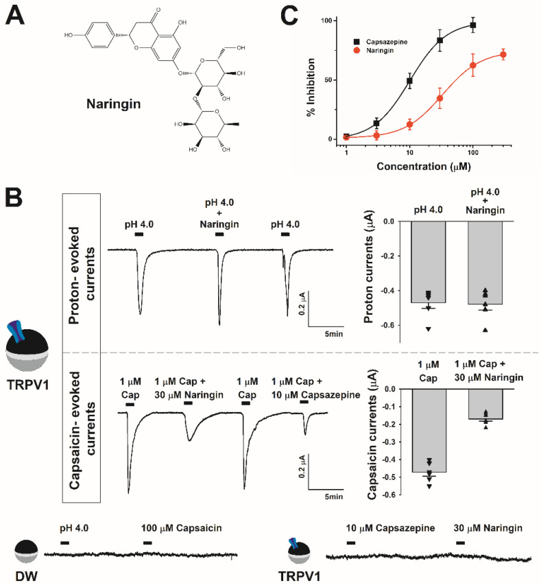 Figure 2. Selective inhibitory effect of capsaicin on TRPV1 and the chemical structure of naringin: (A) 2D structure of naringin. (B) Different inhibitory effects of naringin on proton-evoked currents and capsaicin-evoked currents. In the imaging of proton-evoked currents, naringin was used at a concentration of 30 μM. The TRPV1 oocyte image shows currents measured by injecting TRPV1 mRNA into oocytes. The distilled water-treated oocyte image shows currents measured by injecting tertiary distilled water into oocytes. Cap is capsaicin. Capsazepine is a published antagonist of TRPV1. The treatment was carried out at a pH of 4.0 using the ND96 buffer. (C) The histogram shows the degree of inhibition of TRPV1 inward current by naringin. The data are indicated as the mean ± S.E.M (n = 10–13 from six different frogs).