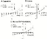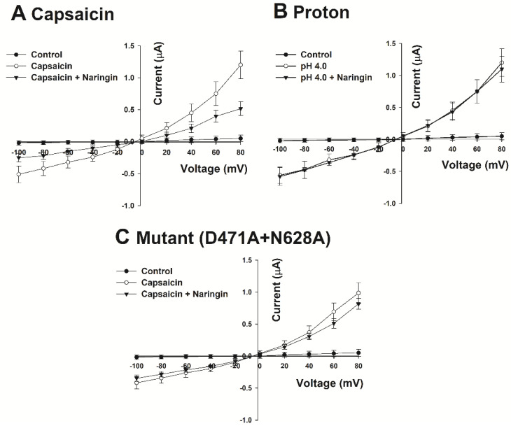 Figure 3. Differences in the current–voltage relationship according to different treatment conditions in TRPV1-expressing oocytes: (A) changes in capsaicin-induced current in response to planned voltage changes. The black circle (●) is the current measured in the oocytes injected with distilled water. White circles (○) are TRPV1-injected oocytes treated with 1 μM capsaicin. Black triangles (▼) show oocytes simultaneously treated with 1 μM capsaicin and 30 μM naringin. ●, ○, and ▼ in (B,C) also show the same trend. (B) Changes in proton-induced current in response to planned voltage changes. (C) Current–voltage relationship measured in oocytes expressing the double mutant D471A + N628A. These data are indicated as the mean ± S.E.M (n = 9–14 from six different frogs).