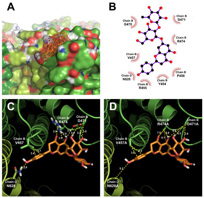 Figure 5. The binding pocket and docking results of naringin and TRPV1: (A) the binding pocket in the TRPV1 region of the extracellular domain membrane pocket side. (B) Two-dimensional schematic presentation of the predicted binding mode of naringin in the ligand-binding pocket. The ligands and important residues are shown. (C,D) Computational simulated binding interaction of ligand and residues in wild-type and mutants. The replaced mutants showed changes in interaction activities at varying degrees. (C) Interaction between naringin and wild-type TRPV1. (D) Interaction between naringin and mutant-type TRPV1.