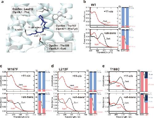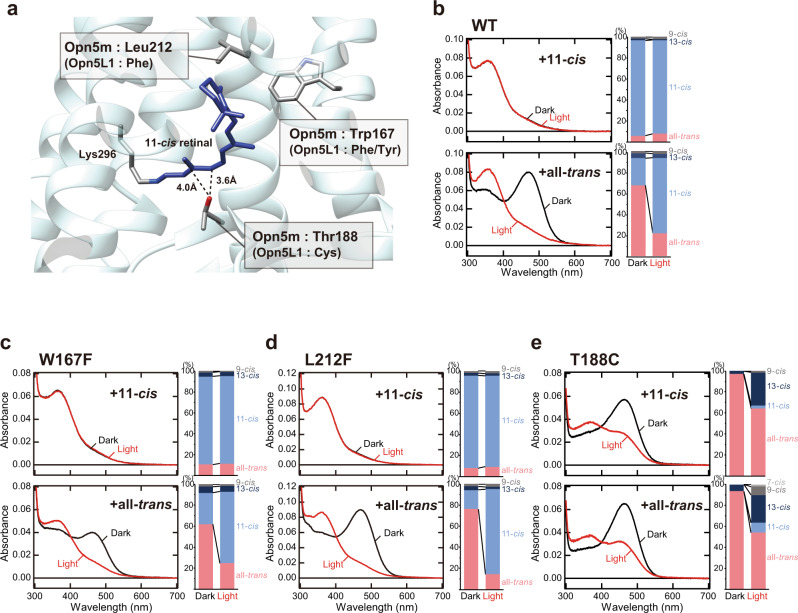 Fig. 1. Binding selectivity of retinal isomers in wild-type and W167F, L212F, and T188C mutant Opn5m proteins.a Different amino acid residues around the retinal between Opn5m and Opn5L1 subgroups. A structural model was constructed based on the crystal structure of squid rhodopsin (PDB: 2z73) visualized using UCSF Chimera27. Squid rhodopsin has serine and phenylalanine at positions 188 and 212 (based on the bovine rhodopsin numbering system) (Supplementary Fig. 1), which were replaced by threonine and leucine in this model. b-e (left) Absorption spectra of Opn5m wild-type (b) and W167F (c), L212F (d), and T188C (e) mutant proteins purified after the addition of 11-cis or all-trans retinal to the collected cell membranes. The spectra were recorded at 0 °C in the dark (curve 1) and after yellow light (>500 nm) irradiation (curve 2). Spectral change by light irradiation is shown in left panels of Supplementary Fig. 2a–h. (right) Retinal configuration changes of Opn5m wild-type (b) and W167F (c), L212F (d), and T188C (e) mutant proteins purified after the addition of 11-cis or all-trans retinal to the collected cell membranes. The retinal isomers before and after yellow light (>500 nm) irradiation were analyzed with HPLC after extraction of the chromophore as retinal oximes (right panels of Supplementary Fig. 2a–h). The negative peak in the visible region of the difference spectrum calculated before and after yellow light irradiation of the wild-type (Supplementary Fig. 2e) corresponds to λmax of the all-trans retinal bound form (474 nm). λmax of the all-trans retinal bound form of the mutant proteins calculated from their difference spectra (Supplementary Fig. 2f–h) are 470 nm (W167F), 475 nm (L212F), and 470 nm (T188C).