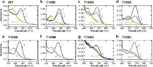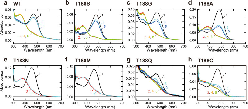 Fig. 3. Spectral changes of wild-type and Thr188 mutant Opn5m proteins.Absorption spectra of Opn5m wild-type (a) and T188S (b), T188G (c), T188A (d), T188N (e), T188M (f), T188Q (g), and T188C (h) mutant proteins purified after the addition of all-trans retinal to the medium of the transfected cultured cells. The spectra were recorded at 0 °C in the dark (curve 1), after yellow light (>500 nm) irradiation (curve 2), after subsequent UV light (360 nm) irradiation (curve 3), after yellow light re-irradiation (curve 4), after UV light re-irradiation (curve 5) and after yellow light re-irradiation (curve 6). Spectral changes by each light irradiation are shown in Supplementary Fig. 5.