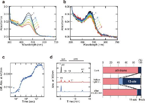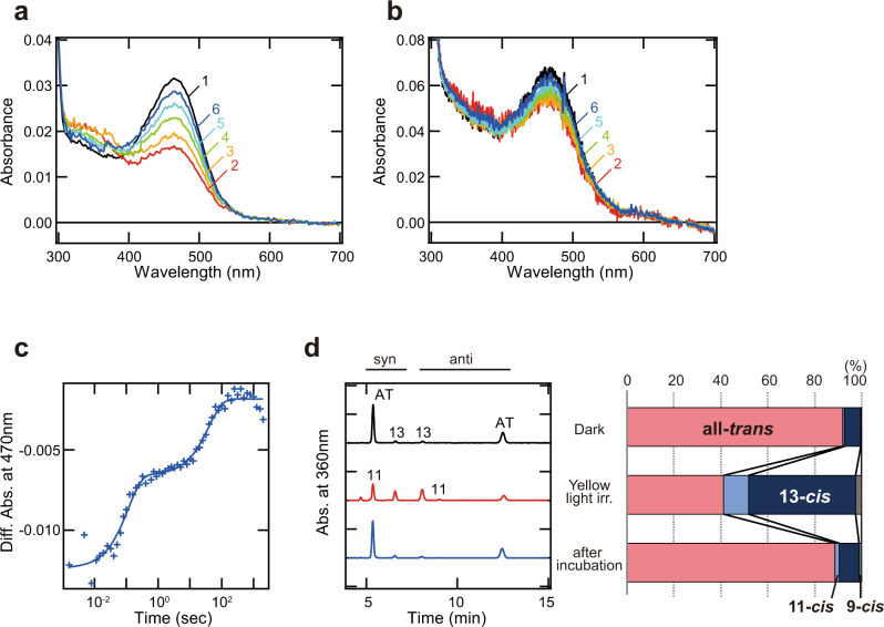 Fig. 4. Molecular characteristics of T188C mutant Opn5m protein.a, b Absorption spectra of Opn5m T188C mutant protein purified after the addition of all-trans retinal to the medium of the transfected cultured cells. The spectra were recorded at 10 °C (a) in the dark (curve 1) and 0, 4.33, 16.5, 37.5, and 116 min after yellow light (>500 nm) irradiation (curve 2–6). Spectral changes observed during the incubation in the dark after light irradiation are shown in Supplementary Fig. 6a. The spectra of T188C mutant protein were also recorded at 37 °C (b) in the dark (curve 1) and 0.0016, 0.032, 0.10, 3.26, 1995 s after yellow flash light (>460 nm) irradiation (curve 2–6). Spectral changes observed during the incubation in the dark after light irradiation are shown in Supplementary Fig. 6b. c Absorption change of Opn5m T188C mutant protein at 470 nm after light irradiation at 37 °C. Time course of the absorbance at 470 nm was plotted according to the data in Supplementary Fig. 6b and was fitted with a double-exponential function (τ = 0.11 and 39.2 s). These time constants are more than 200 times faster than that of chicken Opn5L1 (τ = 175 min) as described previously18. d Retinal configuration analysis of Opn5m T188C mutant protein. (Left) Retinal isomers of Opn5m T188C mutant protein purified after reconstitution with all-trans retinal were analyzed with HPLC after extraction of the chromophore from the samples before irradiation (black), after yellow light irradiation (red) and after subsequent incubation for 2 h in the dark (blue) as retinal oximes. AT, all-trans retinal; 11, 11-cis retinal; 13, 13-cis retinal. (Right) Isomeric compositions of retinal before light irradiation, after light irradiation, and after subsequent incubation.
