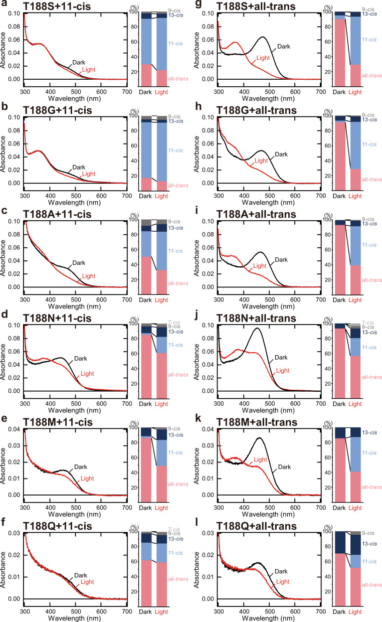 Fig. 2. Binding selectivity of retinal isomers in Opn5m Thr188 mutant proteins.a–f (left) Absorption spectra of Opn5m T188S (a), T188G (b), T188A (c), T188N (d), T188M (e), and T188Q (f) mutant proteins purified after the addition of 11-cis retinal to the collected cell membranes. The spectra were recorded at 0 °C in the dark (curve 1) and after yellow light irradiation (curve 2). Spectral change by light irradiation is shown in Supplementary Fig. 3. (right) Retinal configuration changes of Opn5m T188S (a), T188G (b), T188A (c), T188N (d), T188M (e), and T188Q (f) mutant proteins purified after the addition of 11-cis retinal to the collected cell membranes. The retinal isomers before and after yellow light (>500 nm) irradiation were analyzed with HPLC after extraction of the chromophore as retinal oximes. (Supplementary Fig. 4a–f). g–l (left) Absorption spectra of Opn5m T188S (g), T188G (h), T188A (i), T188N (j), T188M (k), and T188Q (l) mutant proteins purified after the addition of all-trans retinal to the collected cell membranes. The spectra were recorded at 0 °C in the dark (curve 1) and after yellow light irradiation (curve 2). Spectral change by light irradiation is shown in Supplementary Fig. 3. (right) Retinal configuration changes of Opn5m T188S (g), T188G (h) T188A (i), T188N (j), T188M (k), and T188Q (l) mutant proteins purified after the addition of all-trans retinal to the collected cell membranes. The retinal isomers before and after yellow light (>500 nm) irradiation were analyzed with HPLC after extraction of the chromophore as retinal oximes. (Supplementary Fig. 4g–l).