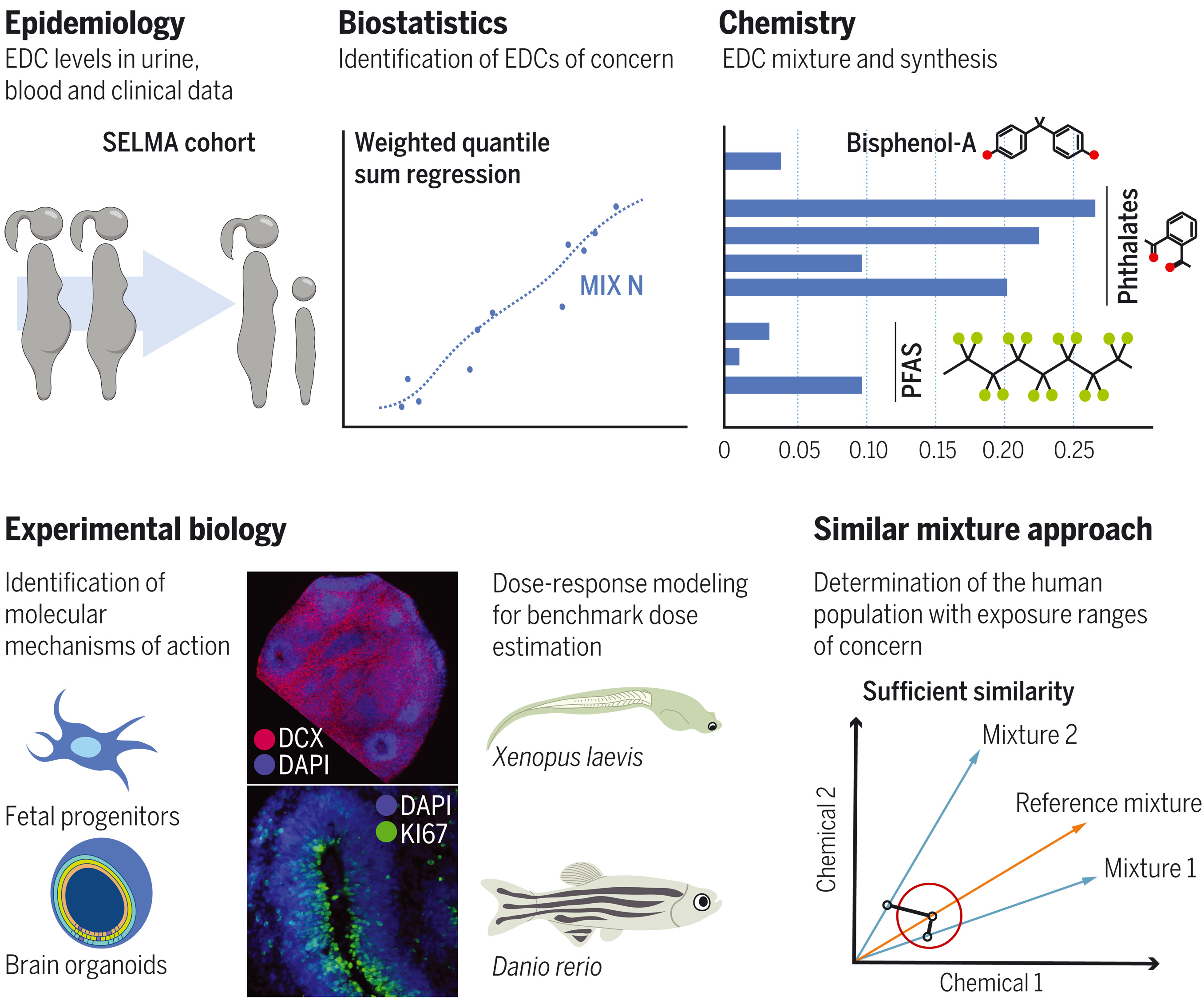 Convergent evidence associates exposure to endocrine disrupting chemicals (EDCs) with major human diseases, even at regulation-compliant concentrations. This might be because humans are exposed to EDC mixtures, whereas chemical regulation is based on a risk assessment of individual compounds. Here, we developed a mixture-centered risk assessment strategy that integrates epidemiological and experimental evidence. We identified that exposure to an EDC mixture in early pregnancy is associated with language delay in offspring. At human-relevant concentrations, this mixture disrupted hormone-regulated and disease-relevant regulatory networks in human brain organoids and in the model organisms Xenopus leavis and Danio rerio, as well as behavioral responses. Reinterrogating epidemiological data, we found that up to 54% of the children had prenatal exposures above experimentally derived levels of concern, reaching, for the upper decile compared with the lowest decile of exposure, a 3.3 times higher risk of language delay.