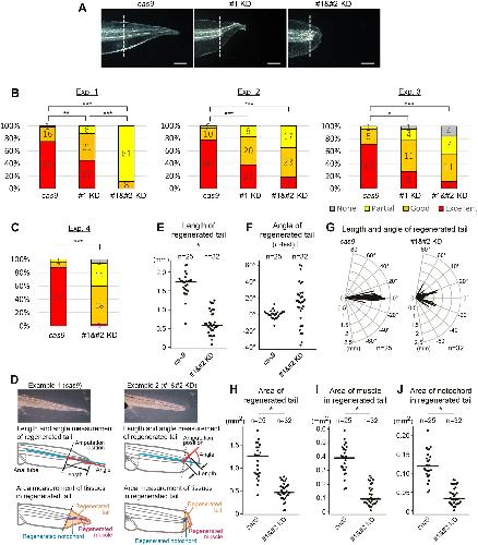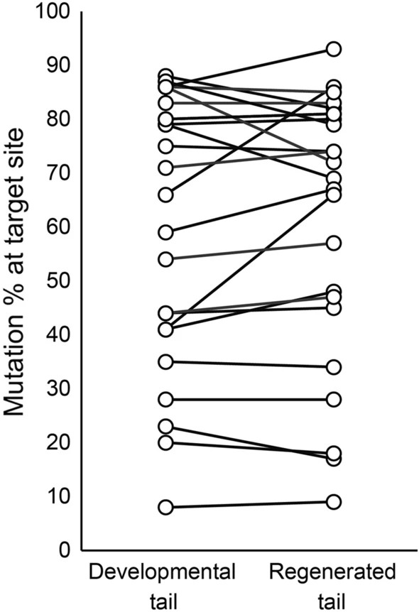 Figure 4. il11ra.L KO cells can contribute to form the regenerated tail. Estimated mutation ratio at the guide RNA #1 target site of the developmental and regenerated tail of each individual is shown. Linked points represent the same individual. nâ=â24. Pâ=â0.44, paired t-test. Representative result of 2 experiments is shown. The result of the second experiment is shown in Fig. S7.
