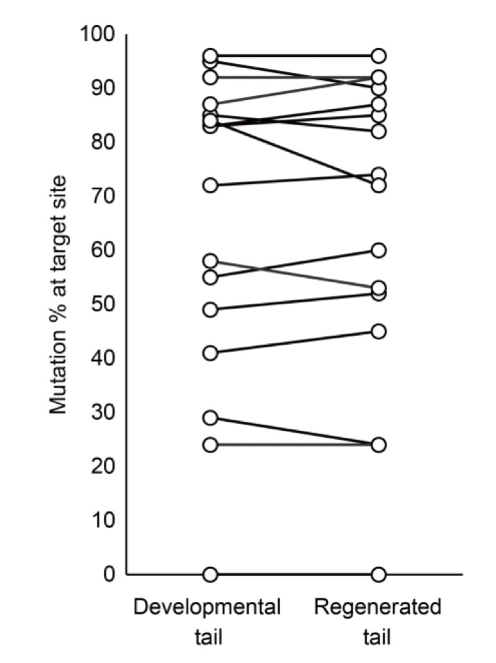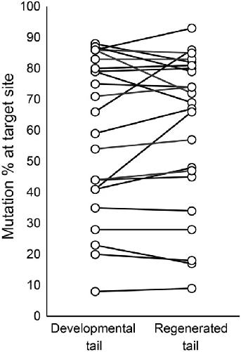 Supplementary Fig. S7 Second result of the mutation ratio estimation of developmental and regenerated tails. n=16. P=0.79, paired t-test.